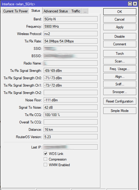 Saab95 Posted July 3, 2013 Posted July 3, 2013 Что нашел жертву новую? Снова микротик, джирус и ланмарт :) Вам бы только языком трепать? Вот во вложении картинки - стоят несколько Jirous 29 EX-MIMO по одной линии, тест до одного из них, расстояние 16км, с одной стороны 60 метров, с другой 20, видимость перекрывают верхушки деревьев рядом с клиентской антенной. Работают в режиме A-only т.к. не требуются высокие скорости на данный момент: Частота 5450, сигналы -69/-69 Частота 5900, сигналы -69/-69 Частота 6000, сигналы -69/-69 Частота 6100, сигналы -72/-73 Для теста включил мимо на частоте 6000 и получил 68 мегабит прокачки в одну сторону, полоса 20мгц. Трафик других антенн не отключался. Видно что CCQ не 100 процентов, модуляции не самые высокие, поэтому скорость далека от максимума. Поэтому на 5 километров 2 антенны Jirous 29 EX-MIMO заведутся с хорошими сигналами даже на 6100 и позволят передавать хоть 100, хоть 200 или даже 300 мегабит реального трафика. Вставить ник Quote