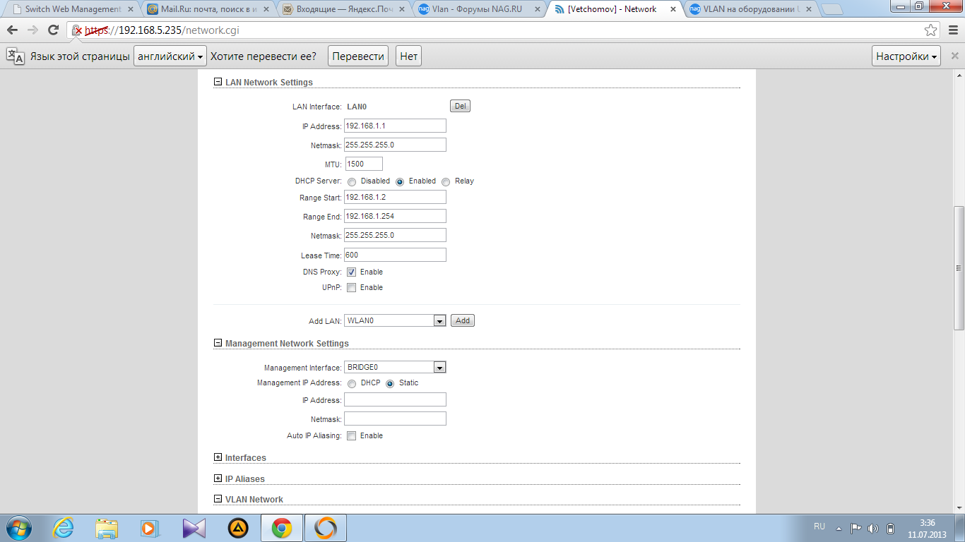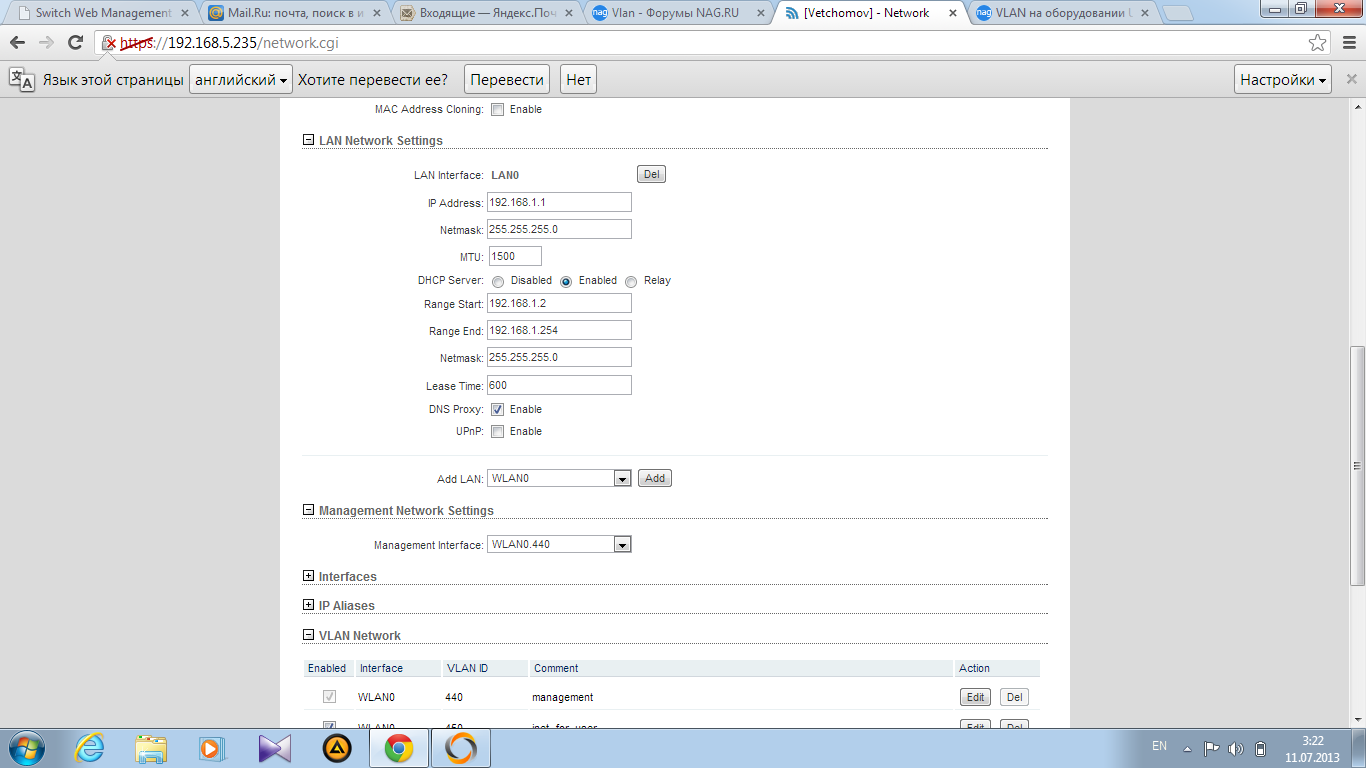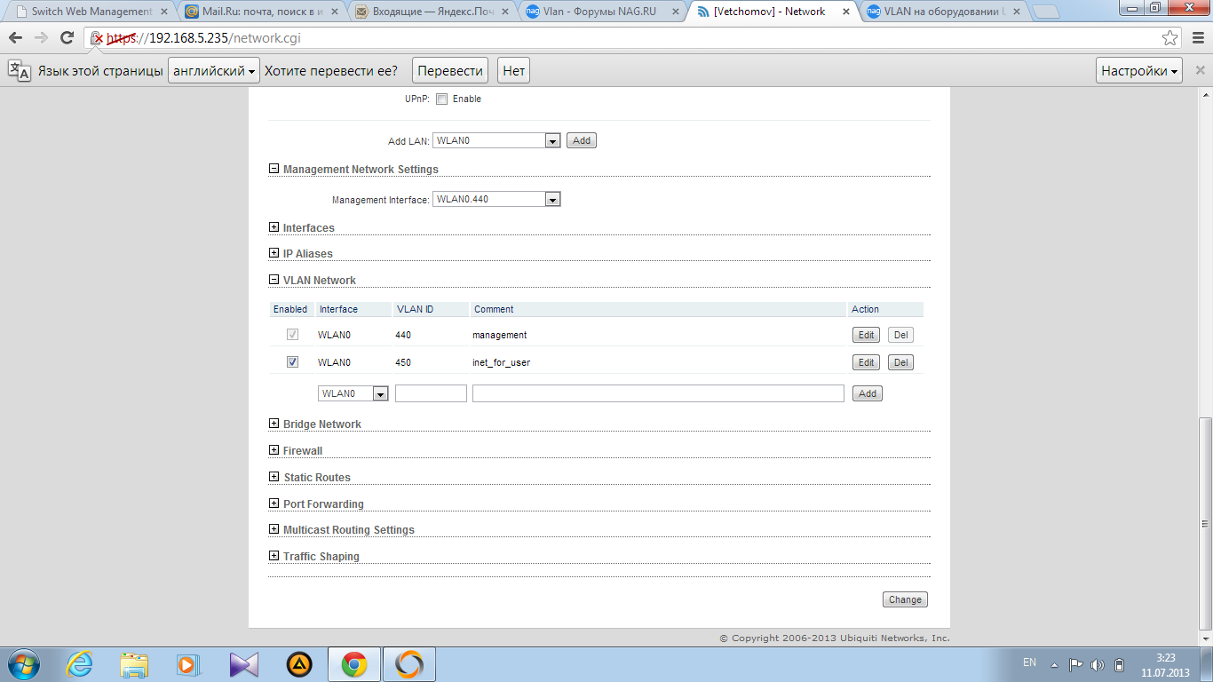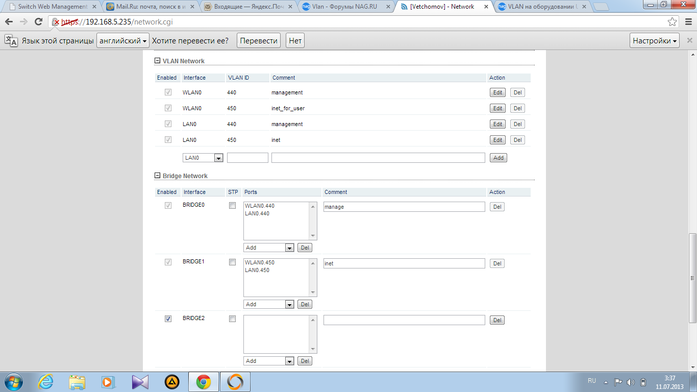 YuryD Posted July 10, 2013 Posted July 10, 2013 На закладке сеть - advansed создаете нужные vlan на интервейсах wlan и lan, т.е. появятся wlan.10 и lan.10 wlan.xxx и lan.xxx Далее создаете нужные бриджи, обьединяя wlan.10 и lan.10, wlan.xxx и lan.xxx Далее - задаете нужный бридж для управления. Вставить ник Quote