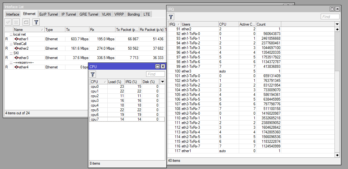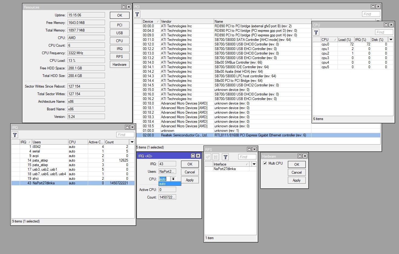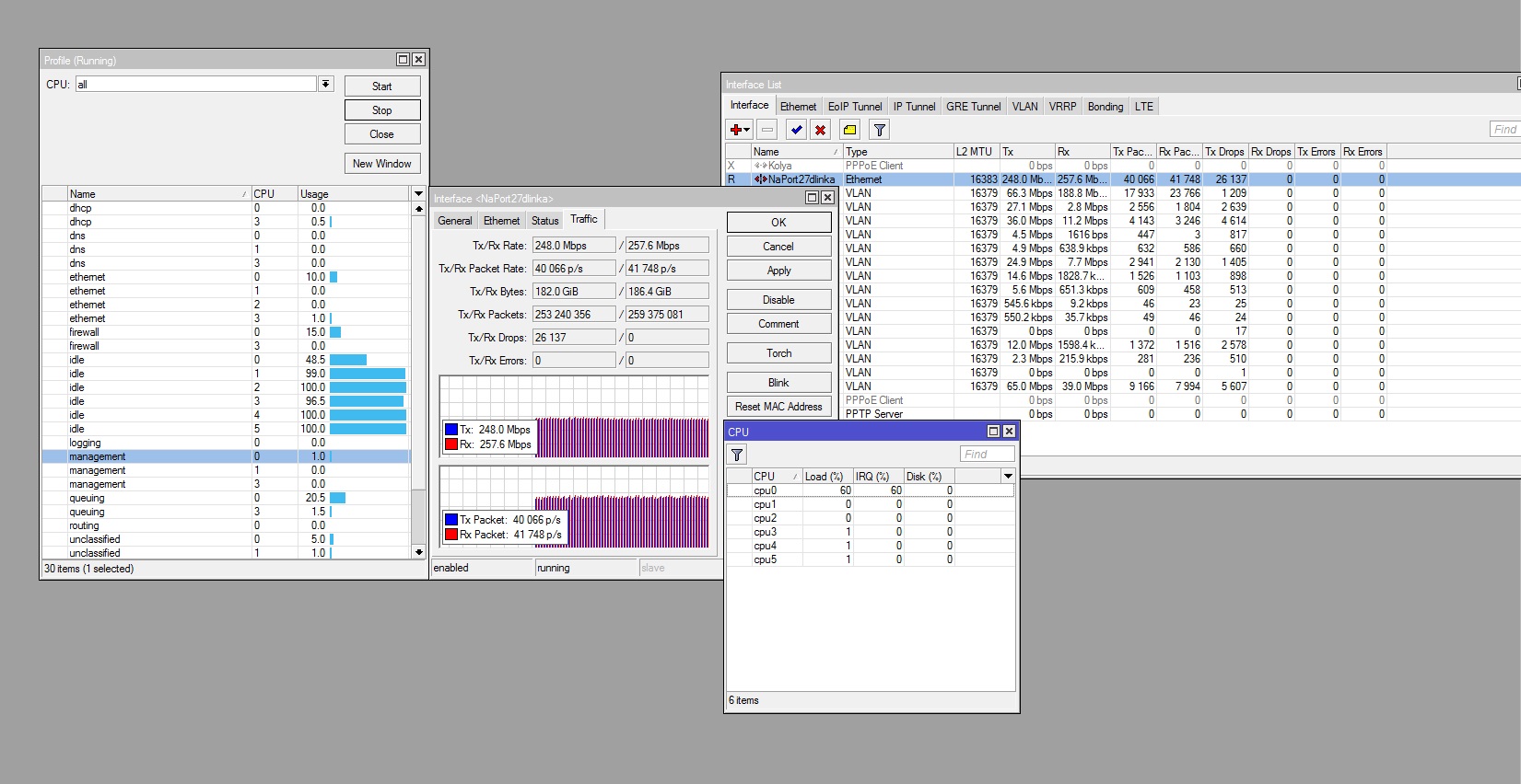 AKim Posted July 21, 2013 Posted July 21, 2013 Здравствуйте! Прошу помочь разобраться в сложившейся ситуациии, ибо идеи уже кончились. В общем имеется сеть на 700 человек, постоянный онлайн 300-400 человек, канал 200 мбит (40-48 kp/ps в пике) в обе стороны. Используется шейпер pcq без QoS (4,8,12,16М), DHCP, RIP (маленькая часть сети) и простая маршрутизация. Всё это крутилось на микротике 5.24 (лицензия) и стареньком сокете 945 с процессором Intel 2,8 Ггц (Hyper-threading). Месяца два назад микротик начал зависать намертво. Переодичности нет никакой. Может отработать две недели, а может зависнуть через 2 часа. Загрузка процессора в час пик держалась на уровне 50-60%. Решили обновить сервер на более мощный. Собрали систему на AM3+, AMD FX100 процессор, 2Гб оперативной памяти, сетевая плата встроенная RTL8111/8168B, но ничего не изменилось. Микротик так же виснет, нагрузка лежит только на 1 ядре из 6 (60-70%), остальные не грузятся вообще. В логах после зависания нет ничего. Для того чтобы были задействаны остальные ядра, как я понял, нужно поставить другую сетевую карту. Что-то вроде этого: Intel_E1G42ET_Gigabit_Adapter_Dual_PCIE_x4_1000Mbps. А вот с чем связаны зависания, мне выяснить не удалось. Я перепробовал всё: сбрасывал микротик, настраивал всё заново, пробовал использовать ломаный микротик и т.д Подскажите кто чем может =) Вставить ник Quote