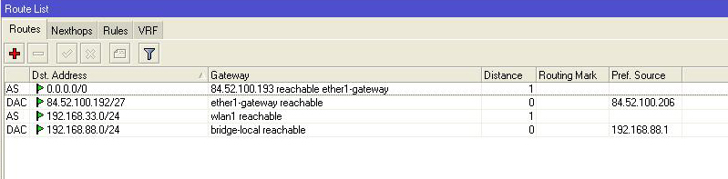 MaxPansky Posted July 26, 2013 Author Posted July 26, 2013 т.е. исключить wlanы из бриджей с обеих сторон ? Ведь они получают ИП из бриджей . Для начала стоит ознакомится с тем что такое бридж. В случае микротика он объеденяет несколько интерфейсов в один. Используется бридж, ip вешается только на него, интерфейсам которые в бридже ip адреса не нужны. Даже не буду спорить с этим утверждение , все верно. Только как мне это поможет в решении моего вопроса мне не совсем ясно. По простому : Я клиент на стороне второго Микротика. Мне нужен Интернет. Ок. Подключаюсь к Микротику , по DHCP получаю настройки ( В моем случае из подсетки 192.168.33.0 ). Все получилось. Но Интернета нет. Почему ? Идем на Микротик. Смотрим. Такс , канал с главным Микротиком есть , Вот он WDS под wlan ом . Здорово. И даже ИП адрес последнего показывает , если смотреть Registration ( 192.168.88.1 ). Это он , наш Gateway для подсетки 192.168.33.0/24 . Он нам Интернет раздаст. Ан нет. Не раздаст , потому , что по МАКу я его пинговать могу , а по ИП нет. Канальный уровень работает , а сетевой нет. Значит ... Думаем . Проблема наверняка в маршрутизации , не туда пакеты то идут. А вот здесь то и затык . Вроде показал пакетам через какой интерфейс идти. На главном Микротике для подсетки 192.168.33.0/24 идите через wlan , а для второго Микротика тоже ног только в обратную сторону. Не идут собаки , хоть ты тресни. Помощи ищу. Вставить ник Quote