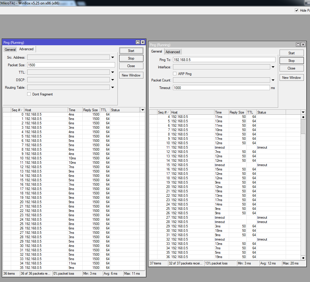 Saab95 Posted July 29, 2013 Posted July 29, 2013 По радио, на бриджах, На изображении пинг в интернет. Без потерь. Ну значит есть где искать. Если агрегация включена то оборудование пакует маленькие пакеты и передает их пачками, отсюда и большая задержка, если другого трафика в этот момент нет. Запустите пинг с интервалом в 100мс, а не 1000, и например несколько на один адрес, один пакетами 64 байта, а другой 1000, и увидите как перестанет задержка на маленьких увеличиваться. На вкладке ADVANCED всех радио устройств уменьшите пункты агрегации до 8 и 8000. Проведите тесты. Так же убедитесь что у вас клиенты не гадят в сеть и нет большого количества маков в одном сегменте, продукция убнт не любит, когда их более 50-100, начинает пакеты терять. Если у вас в сети есть микротик, попробуйте сделать до него пинг по маку, через IP->Neighbors, и посмотрите теряются ли мелкие пакеты до него. Вставить ник Quote
