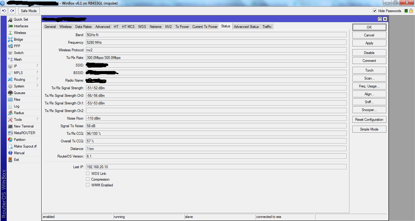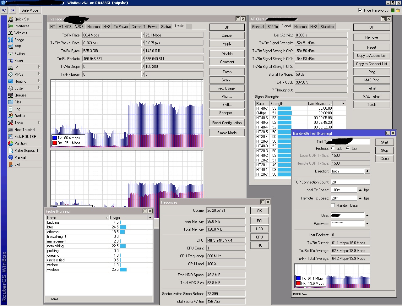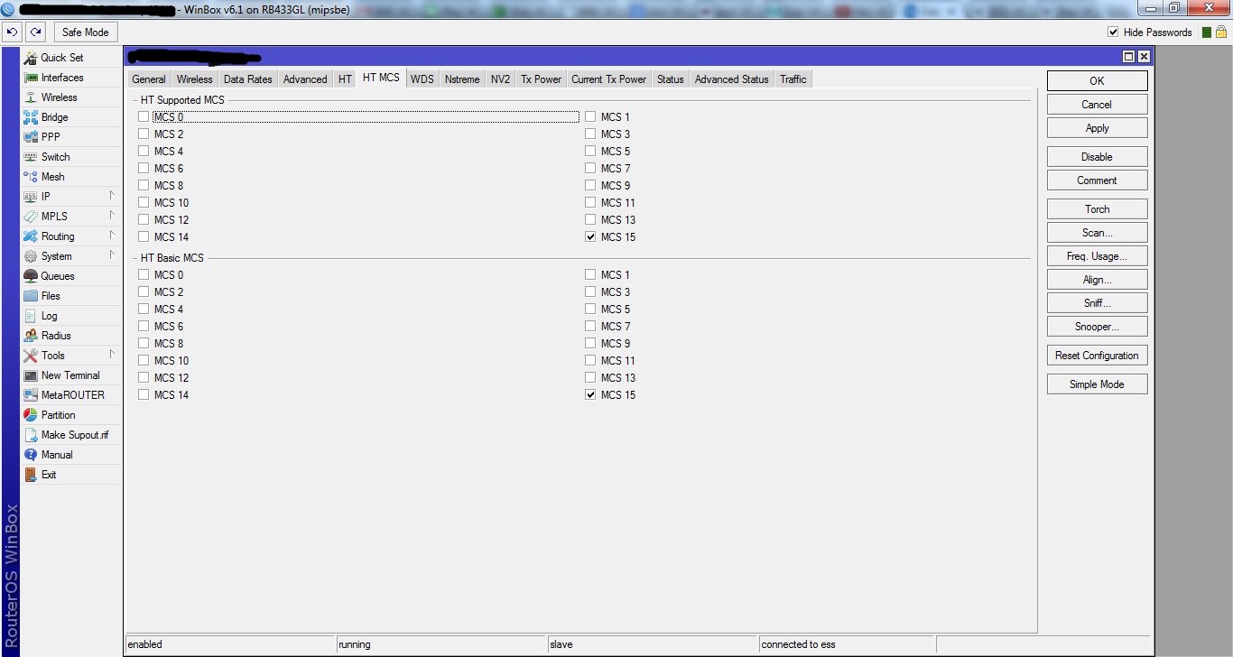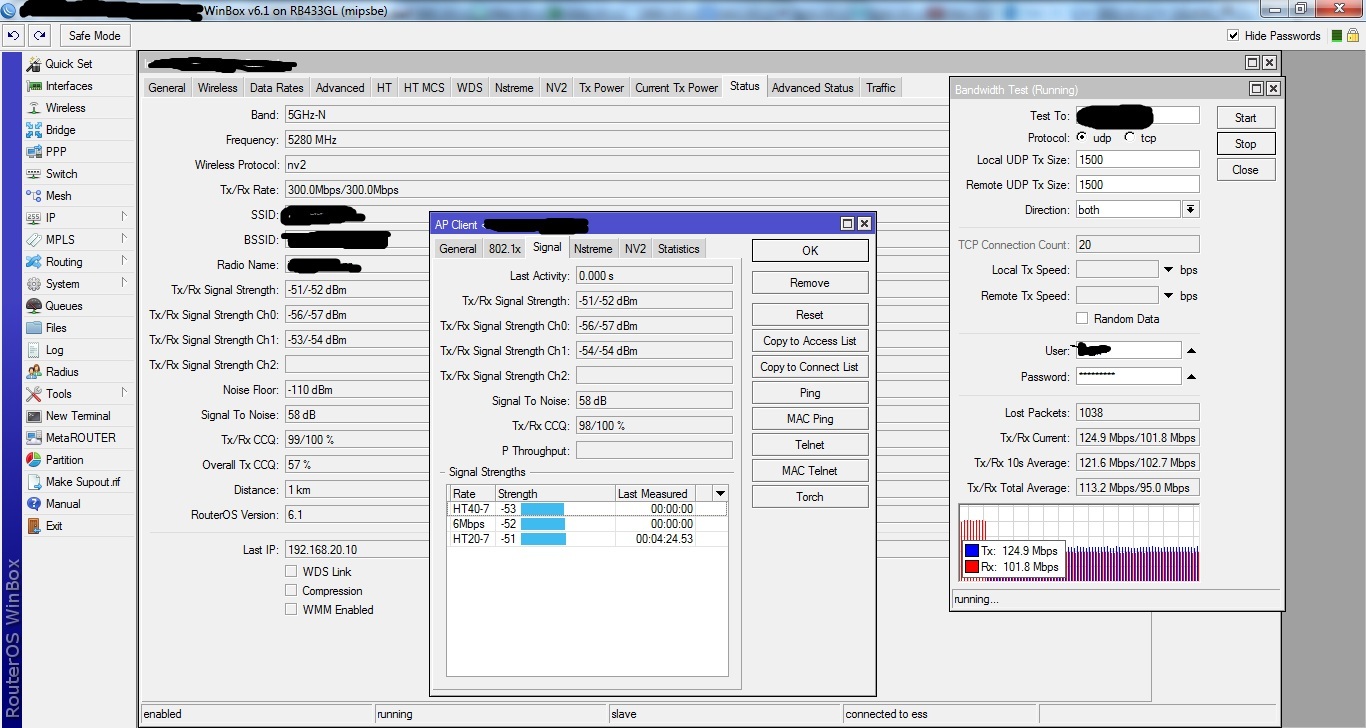 SSD Posted August 1, 2013 Posted August 1, 2013 Привет всем! Ребята помогите разобраться...... Стоит интервал точка-точка на расстоянии 1км прямой видимости, зона Френеля чистая, частота свободная. Борды RB433Gl и карточки R52hn, антенны 2х2 mimo, Rocketdish 5g30 Не могу понять почему не работает модуляция MCS-15. MCS15 это канальная скорость. Судя по скрину вы на ней и работаете. Скорость 300 в обе стороны. Вставить ник Quote