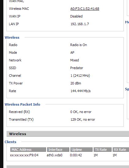 MaximusBeat Posted August 2, 2013 Author Posted August 2, 2013 попробуйте мощность уменьшить в несколько раз на расстоянии 50м должно завестись на 1дм или около того. Сейчас получается что вы глушите базу. Это сто раз обсуждалось!!!!!!!!!!!! Большое спасибо за ответ!) А не подскажите где менять это значение "1дм" в веб-интерфейсе,или в какой вкладке искать,и главное как ещё данный параметр может называтся,поскольку только что обрыл не нашёл...? вот на скрине похожее,оно или нет? Заранее спасибо за ответ! Вставить ник Quote