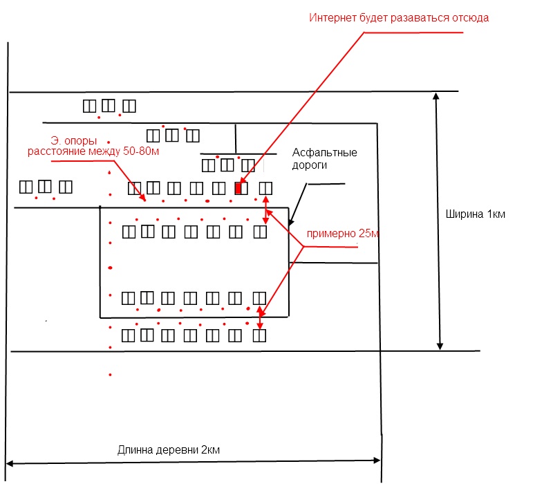 shyrik86 Posted August 28, 2013 Posted August 28, 2013 Приветствую всех! Разговор пойдет о организации защищенной ВОЛС/ВЛС. И так, есть небольшая деревня(около 450 жителей). От благ цивилизации(скоростной интернет) деревня отрезана либо водой(р. волга), либо большим расстоянием(90км пересеченной местности до ближайшего ВОЛС). Недавно познакомился с одним очень хорошим человеком(работает у одного провайдера ближайшего(географически) города), который предложи подать в нашу деревню 10Мбит/сек через Ubiquiti NanoBridge M5. Но с одним условием, мне нужно набрать в деревне минимум 25-30 ч-к и построить между ними защищенную ВЛС. Схема деревни ниже. Строить ВЛС хочу сам, бюджет проекта 300-370 тыс. руб. Теперь сама проблема, мало знаний в построении ВЛС, делал локалку в нескольких офисах на 10-35 машин(знакомые просили) но здесь несколько сложнее. Варианта построения 2 это медь или волокно. Посоветуйте в каком направлении идти(волокно или медь), что нужно изучить чтобы выбрать оборудование и построить сеть? Количество подключаемых может возрасти до 100 ч-к(зависит от качества интернета). Конкуренты только сотовые операторы с 3G модемом(но связь очень плохая). Вставить ник Quote