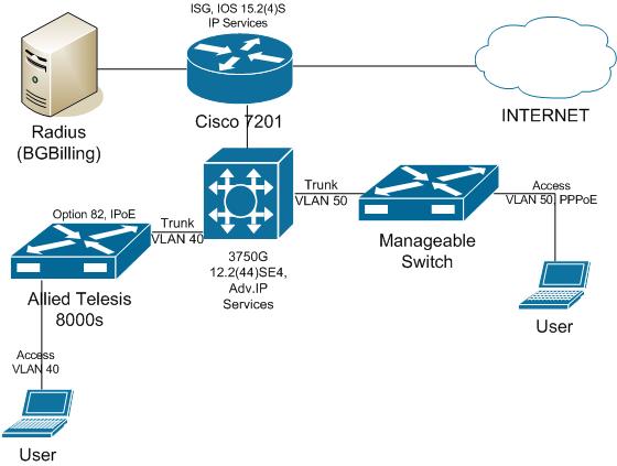 siddkharta Posted September 10, 2013 Posted September 10, 2013 Дамы и господа! При доведении до ума приведенной схемы у меня возникло 2 вопроса. Сам я увы, чего-то не понимаю, посему прошу Вашего вспоможения/совета. Очень приветствуются хоть и резкие, но конструктивные замечания. Конфиги всех сетевых девайсов приведены. 1. Для организации ISG (в частности IPoE для отдельной группы клиентов в Vlan 40) мне было необходимо, чтобы корневой коммутатор Cisco Catalyst 3750G пропускал прозрачно, сформированный на акссесном коммутаторе Allied Telesis 8000s DHCP-запрос с вложенной Option 82. Увы, snooping на Каталисте не помог, запросы на роутер не проходят. При этом если 8000s напрямую подключить к роутеру – всё идет просто замечательно, клиент получает всё необходимое, IPoE работает. То есть проблема в Каталисте. Как ее сконфить, что добавить, чтобы она просто пропускала в транковом ВЛАНе запросы? 2. Как сконфить роутер таким образом, чтобы он одновременно работал с ISG (IPoE) и не ISG (PPPoE обычное)? Allied Telesis 8000s IPoE.txt BRAS-Cisco7201.txt Cisco 3750G.txt Вставить ник Quote