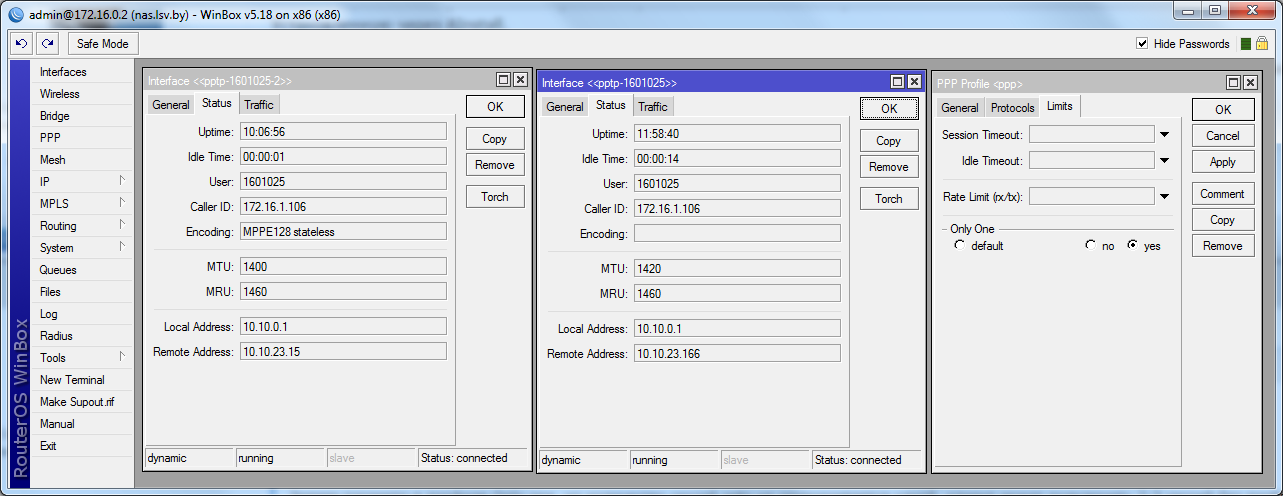npokypop Posted February 8, 2017 Posted February 8, 2017 Используем связку:ABillS 0.58/20150907 (GT: 0.651378) + debian, в качестве NAS - Mikrotik, PPTP.Установленную через AInstall.Нужно ограничить количество сессий от одного аккаунта до 1.Задаем параметр в профиле Only one, но количество сессий pptp не ограничивается одной, клиент может подключить 2-3 сессий без проблем.Каким способом ограничивать ? Спасибо!а сессии случаной не с одинаковым ИП ? Вот, сами все видите. в билинге сессии две ? Да, конечно. Можно и 3 подключить, а можно Х. Вставить ник Quote
