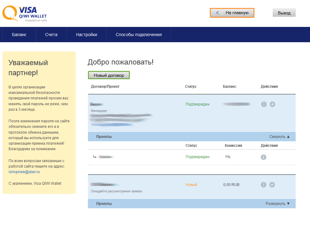Saab95 Posted December 16, 2013 Author Posted December 16, 2013 Зайдите на сайт ishop.qiwi.com, именно COM, под своими учетными данными, увидите там статус магазина. Вверху показан существующий договор и у него статус "Подтвержден", а вот магазин под ним будет в статусе "Новый". Нажмите кнопку "Новый договор", введите все так же, как у существующего. В течении суток статус изменится, а внизу так и останется висеть не подтвержденный новый созданный договор. Далее при необходимости нужно найти в этой учетке настройки SOAP протокола и нажать там кнопочку с паролем, выбрать что использовать такой же пароль, как для вашего договора, там галочку поставить. Так же нужно сменить номер порта на 443. Далее возвращайтесь в старый кабинет .ru и так же поменяйте там номер порта, естественно не забудьте поменять его и в настройках биллинга или в номере порта для проброса, если биллинг напрямую к интернету не подключен. Вот и все. Естественно эта информация получена не от техподдержки=) Вставить ник Quote