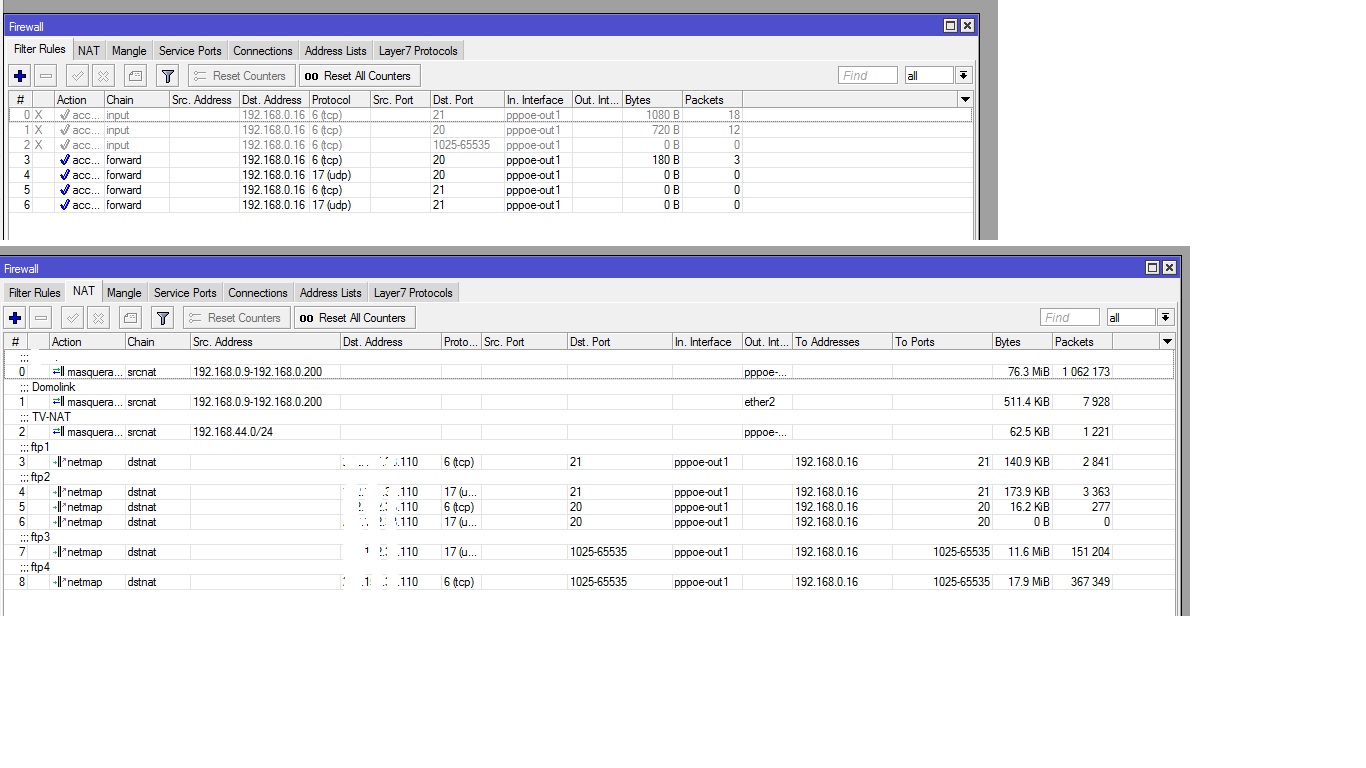 porozut Posted December 11, 2013 Author Posted December 11, 2013 Народ всем доброго времени суток . Собственно есть МТ на нем DHCP + Nat (сеть офиса всего 15машин) ,понадобился FTP сервак поднял я его на SynoLogy DiskStation у него адрес в локалке 192,168,0,16 начинаю пробрасывать порты 21Ftp ,20 авторизация на Ftp , + пулл портов 55530-55665 для передачи данных по резервному каналу протокола, порт21 проброшен и работает ,а вот остальные порты 20,55530-55665 не открываются . Куда копать не пойму подскажите плз? Ftp МТ выключил , на адресс FTP сервера разрешил проход всего из внешки . Надо добавить правило с указанием серого адреса, пробрасываемого порта, и протокола. ip firewall filter add chain=forward dst-address= dst-port= protocol= Это так же сделано - сори что не указал сразу .Даю скрины Ната и правил : Вставить ник Quote
