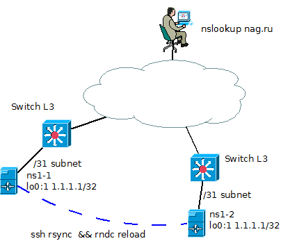 vlad11 Posted December 21, 2013 Posted December 21, 2013 (edited) Схема anycast DNS и синхронизацией по ssh. Еще желательно добавить маршрут к 1.1.1.1/32 по OSPF между switch L3 и ns1-[1,2] Вместо синхронизации соорудите мастер и два слейва ДНС. 1) Ресолвинг внутренних зон через slave зоны 2) Ресолвинг внешних зон (PTR, свои домены) через slave зоны. (можно еще их вынести на внешние секондари ДНС) 3) Все остальное - напрямую. Edited December 21, 2013 by vlad11 Вставить ник Quote