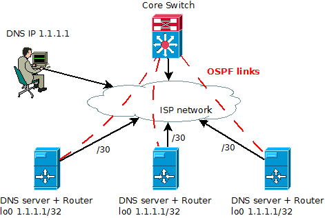 s.lobanov Posted December 12, 2013 Posted December 12, 2013 На самом деле, можно с разных DNS анонсить один и тот же IP. Даже если где-то и будет 2 маршрута в FIB, то всё равно сейчас всё балансируется per-flow, а не per-packet, поэтому никаких проблем не будет. Для связи с внешним миром у каждого DNS-а должен быть свой уникальный IP. Вставить ник Quote