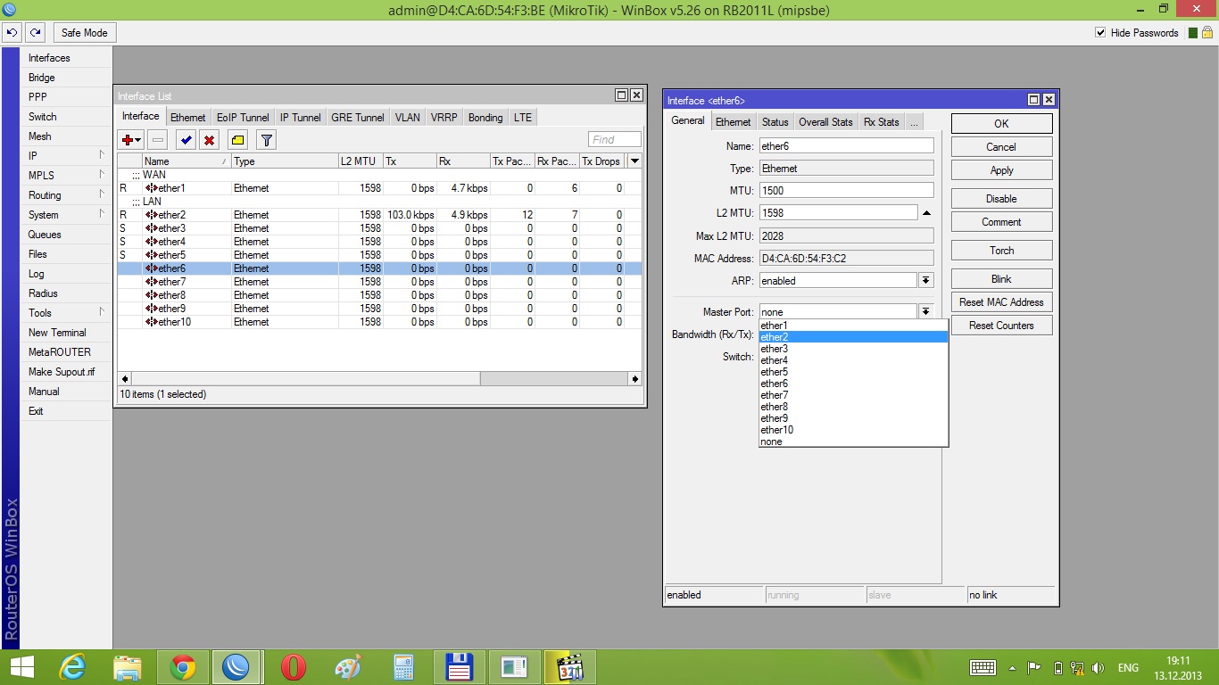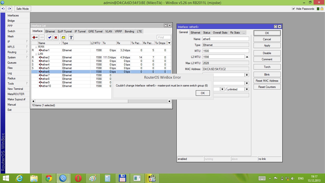 Sipl Posted December 13, 2013 Posted December 13, 2013 Не могу объединить порты на Microtik RB2011L routerOS 5.26 Вот скриншоты: При выборе Master Port значение ether2, выдает ошибку Couldn't change Interface <ether6> - master-port must be in same switch group (6) Что делать? Вставить ник Quote