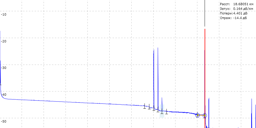 dexter_morgan Posted December 15, 2013 Posted December 15, 2013 (edited) Есть линия.Длина 20 км.На ней 6 сварок в муфтах (потери по 0.2 и одна 0.5),2 патчкорда (из кросса в кросс). Точка А-edge core es3528m. Точка Б-cisco 2960 SFP 80 км с аттенюатором 15 дб. Линия собрана откровенно хреново, но собирать по-другому нет возможности. При подключении оборудования линк поднимается, но со стороны циски нет связи;со стороны эджкора также невозможно пропинговать циску, при этом можно на порту увидеть мак циски и влан.на этом вся их связь заканчивается.такая же ситуация если поставить вместо эджкора, зайксель 3500-28 и длинк 3200-10.только мак циски и все. На скрине ниже предыдущая картина с рефлюка: заменены пигтейлы в конечных кроссах; два отражения это патчкорды в кроссах.третье отражения - непонятно, так как там ничего нет.вопросы к конеккторам в промежуточных кроссах, к полировке. посоветуйте,пожалуйста,что можно сделать.желательно без вскрытия муфт и повторной сварки волокон. Edited December 15, 2013 by dexter_morgan