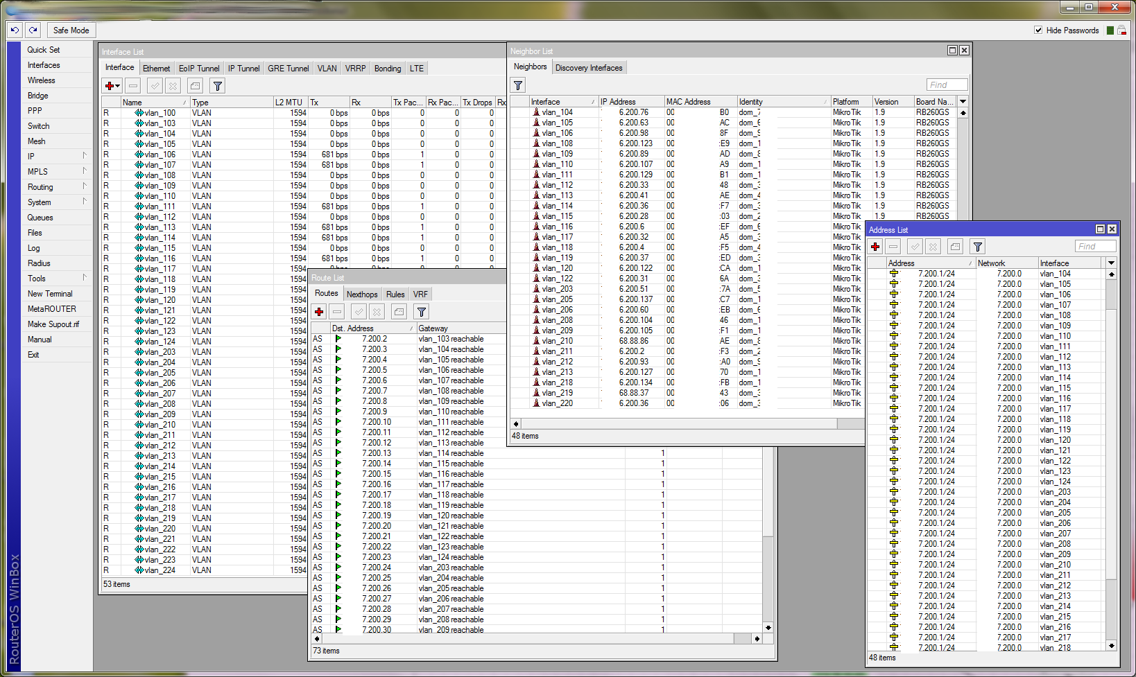 Saab95 Posted December 17, 2013 Posted December 17, 2013 И главное правило, я бы сказал первое, это не слушать советов Saab95, можете смело пропускать его сообщения. Другие советы по делу были? Или кроме как посоветовать циску и дорогущий сервер нет вариантов? Вот вам пример как все выглядит на микротике - создаются вланы, на каждый вешается одинаковая подсеть, адреса указываются маршрутами на нужный интерфейс, так же видны клиентские RB260GS: Вот так в биллинге - заводятся абоненты, указывается адрес и порт коммутатора для справки, всего делов: А так на коммутаторе - добавляется уникальный влан на каждый порт: Вот так все выглядит в центре, только если вести разговор про абонентов, то они не особо спешат подключаться, хотя изначально все давали согласие что подключатся, из более чем 150 абонентов подключена только треть: В такой связке все идет по L3 далее в центр. Вставить ник Quote