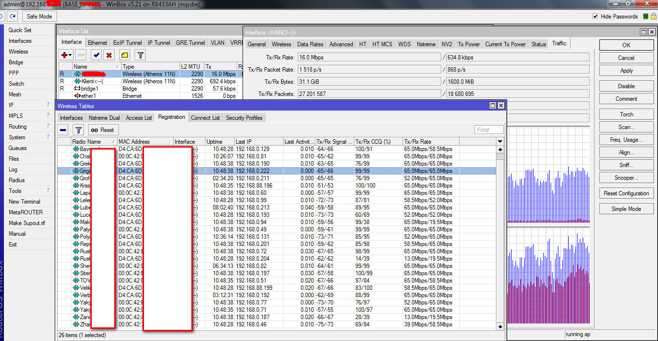 fhntv_smart Posted December 17, 2013 Posted December 17, 2013 (edited) 4. Вызывайте Сааба. :) Щас продет и расскажет, что это неправильный микротик купленный в неправильном магазине. 2462 Раздача в 2.4 Я бы проверил отдачу к клиентам, особенно к тем, у кого низкий ССQ при хорошем сигнале. Может человек себе роутер поставил на этом-же канале. Ну, и клиентам с сигналом -75 антенку поменять. В общем сортировать по CCQ и разбиратся с клиентами. А так, 16 мбит, на 26 человек в 2.4, из которых человек пять с фиговым CCQ... Неплохой результат. Edited December 17, 2013 by fhntv_smart Вставить ник Quote