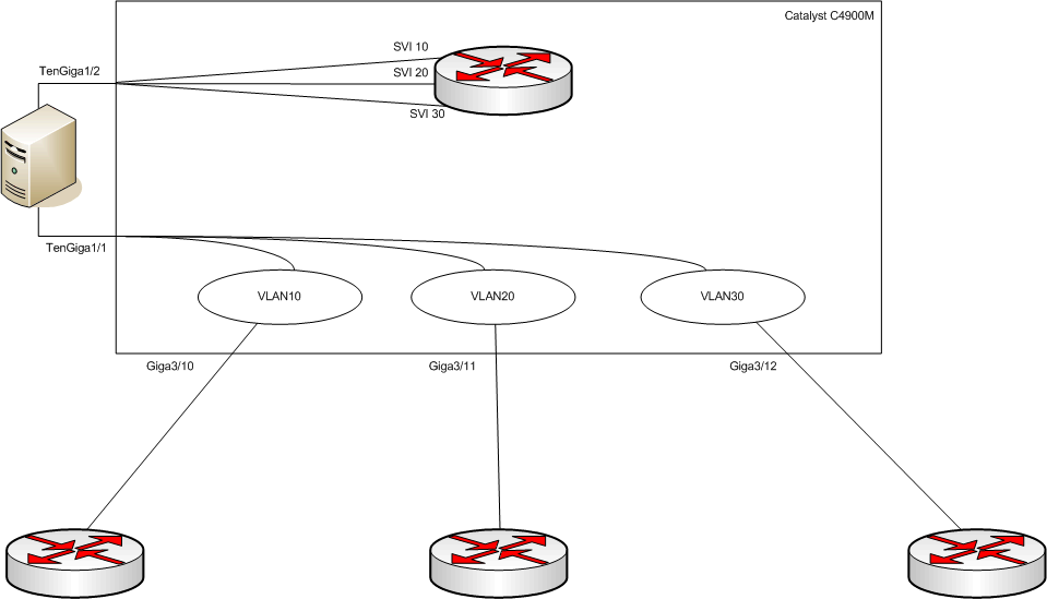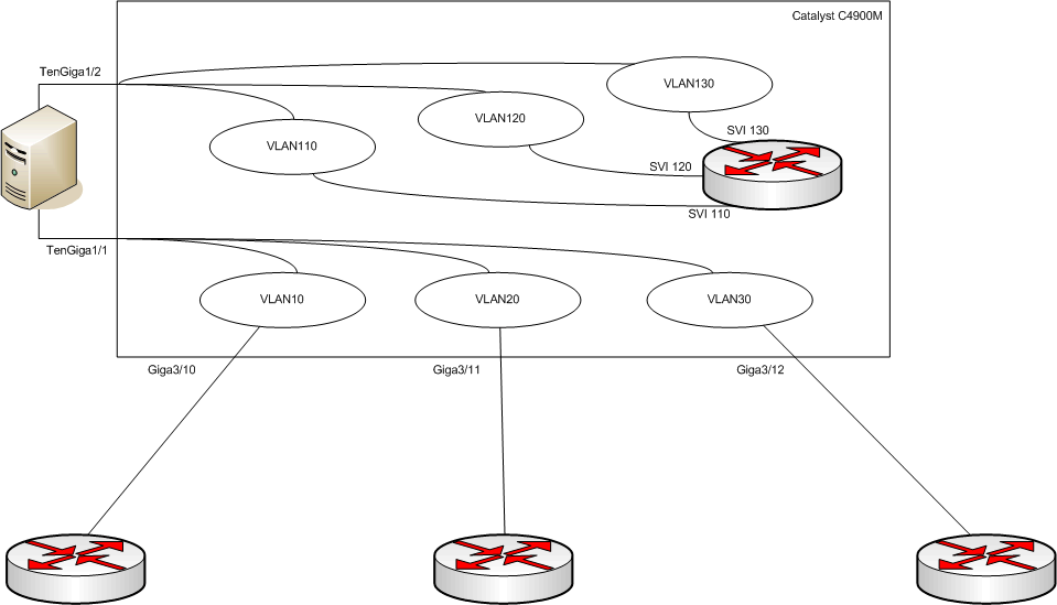 Serhio Go Posted December 18, 2013 Posted December 18, 2013 Всем добрый день. Жил себе спокойно в центре некоей "звезды" Cisco C4900M, IOS 12.2(54)SG1 ENTSERVICESK9-M, агрегировал IP-трафик с более мелких узлов. Примерно так,как на первой схеме. И тут понадобилось некоторые из этих P2P линков (от одного до шести-семи) протащить через двухпортовую 10Gbps сетевую карту некоего сервера без применения дополнительных промежуточных коммутаторов. Примерно как на второй схеме. Сервер для транзитного трафика вроде как прозрачен, т.е. ни на L2, ни на L3 не светится. Как это сделать? Один любой линк в untagged-режиме протаскивается без проблем: 4900M#show run inter te1/1 Building configuration... ! interface TenGigabitEthernet1/1 switchport access vlan 10 switchport mode access load-interval 30 spanning-tree portfast spanning-tree bpdufilter enable spanning-tree bpduguard enable end 4900M#show run inter te1/2 Building configuration... ! interface TenGigabitEthernet1/2 switchport access vlan 110 switchport mode access load-interval 30 spanning-tree portfast spanning-tree bpdufilter enable spanning-tree bpduguard enable end 4900M# Конфигурация SVI c VLAN10 просто переносится в некий промежуточный VLAN110 с сохранением всех настроек (IP, OSPF итп.), удаленный роутер не трогается, он по-прежнему работает с VLAN10. Все замечательно. Но как провернуть тот же фокус с несколькими линками? Смотрю в сторону VLAN Mapping, описанного здесь. Вроде бы то, что мне нужно. Делаю для начала хотя бы один линк, тот же, что в предыдущем примере, но теперь порты сервера в режиме транка. 4900M#show run inter te1/1 ... interface TenGigabitEthernet1/1 switchport mode trunk switchport vlan mapping 110 10 load-interval 30 end 4900M#show run inter te1/2 ... interface TenGigabitEthernet1/2 switchport mode trunk switchport vlan mapping 10 110 load-interval 30 end Не работает. Причем сам по себе маппинг работает, если взять и реализовать сценарий, описанный в мануале, один-в-один. Но у меня сценарий несколько иной - трафик нужно принять от самого себя и отдать самому себе. Это реализуемо в рамках одного свитча или нет? Вставить ник Quote