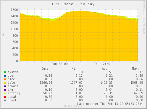 BETEPAH Posted February 17, 2014 Posted February 17, 2014 (edited) Давно уже мониторю с помощью этого замечательного средства серверы. Но тут обратил внимание на странный график: При этом в это же время: # top top - 22:15:35 up 356 days, 21:38, 2 users, load average: 0.19, 0.16, 0.12 Tasks: 204 total, 2 running, 202 sleeping, 0 stopped, 0 zombie Cpu(s): 0.0%us, 0.1%sy, 0.0%ni, 95.7%id, 0.0%wa, 0.0%hi, 4.2%si, 0.0%st Mem: 16439252k total, 1863168k used, 14576084k free, 194908k buffers Swap: 8388604k total, 0k used, 8388604k free, 801544k cached PID USER PR NI VIRT RES SHR S %CPU %MEM TIME+ COMMAND 13 root 20 0 0 0 0 S 1.0 0.0 988:38.62 ksoftirqd/1 18 root 20 0 0 0 0 S 1.0 0.0 982:57.70 ksoftirqd/2 33 root 20 0 0 0 0 S 1.0 0.0 966:14.01 ksoftirqd/5 3 root 20 0 0 0 0 S 0.7 0.0 983:30.89 ksoftirqd/0 23 root 20 0 0 0 0 R 0.7 0.0 981:26.97 ksoftirqd/3 28 root 20 0 0 0 0 S 0.7 0.0 971:50.97 ksoftirqd/4 38 root 20 0 0 0 0 S 0.7 0.0 976:08.64 ksoftirqd/6 43 root 20 0 0 0 0 S 0.7 0.0 981:19.61 ksoftirqd/7 48 root 20 0 0 0 0 S 0.7 0.0 983:53.91 ksoftirqd/8 53 root 20 0 0 0 0 S 0.7 0.0 1017:41 ksoftirqd/9 58 root 20 0 0 0 0 S 0.7 0.0 1063:48 ksoftirqd/10 63 root 20 0 0 0 0 S 0.7 0.0 992:10.16 ksoftirqd/11 68 root 20 0 0 0 0 S 0.7 0.0 1009:06 ksoftirqd/12 73 root 20 0 0 0 0 S 0.7 0.0 989:53.56 ksoftirqd/13 78 root 20 0 0 0 0 S 0.7 0.0 975:21.03 ksoftirqd/14 83 root 20 0 0 0 0 S 0.7 0.0 973:38.41 ksoftirqd/15 3351 named 20 0 1233m 19m 2776 S 0.7 0.1 49:30.70 named 125 root 20 0 0 0 0 S 0.3 0.0 13:41.70 kworker/9:1 13951 dhcpd 20 0 55124 12m 636 S 0.3 0.1 0:08.57 dhcpd 1 root 20 0 19276 1504 1236 S 0.0 0.0 0:03.28 init 2 root 20 0 0 0 0 S 0.0 0.0 0:00.25 kthreadd 5 root 0 -20 0 0 0 S 0.0 0.0 0:00.00 kworker/0:0H 7 root 0 -20 0 0 0 S 0.0 0.0 0:00.00 kworker/u:0H 8 root RT 0 0 0 0 S 0.0 0.0 0:07.96 migration/0 9 root 20 0 0 0 0 S 0.0 0.0 0:00.00 rcu_bh 10 root 20 0 0 0 0 S 0.0 0.0 99:33.42 rcu_sched 11 root RT 0 0 0 0 S 0.0 0.0 1:06.93 watchdog/0 12 root RT 0 0 0 0 S 0.0 0.0 1:06.62 watchdog/1 14 root RT 0 0 0 0 S 0.0 0.0 0:45.90 migration/1 16 root 0 -20 0 0 0 S 0.0 0.0 0:00.00 kworker/1:0H 17 root RT 0 0 0 0 S 0.0 0.0 0:51.12 watchdog/2 19 root RT 0 0 0 0 S 0.0 0.0 0:09.91 migration/2 21 root 0 -20 0 0 0 S 0.0 0.0 0:00.00 kworker/2:0H 22 root RT 0 0 0 0 S 0.0 0.0 0:51.42 watchdog/3 24 root RT 0 0 0 0 S 0.0 0.0 0:06.58 migration/3 26 root 0 -20 0 0 0 S 0.0 0.0 0:00.00 kworker/3:0H 27 root RT 0 0 0 0 S 0.0 0.0 0:50.17 watchdog/4 Вопрос: top чего-то не учитывает или munin просто строит неправильный график. update: сорри, не тот вывод запостил Edited February 17, 2014 by BETEPAH Вставить ник Quote