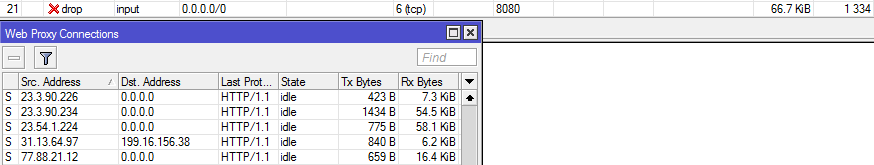 5exi Posted February 20, 2014 Posted February 20, 2014 (edited) Здравствуйте. Настроен webproxy на mikrotik. Снаружи порт webproxy закрыл. Но при этом в Web Proxy Connection постоянно наблюдаю как с одного внешнего ip адреса запрашивают другой внешний, без намёка на внутренную сеть. Проверял из дома открыт ли порт, сам пытался выйти в инет через proxy, указывая рабочий proxy - нет эффекта. Пример прикладываю. Это нормально? И как так? Edited February 20, 2014 by 5exi Вставить ник Quote