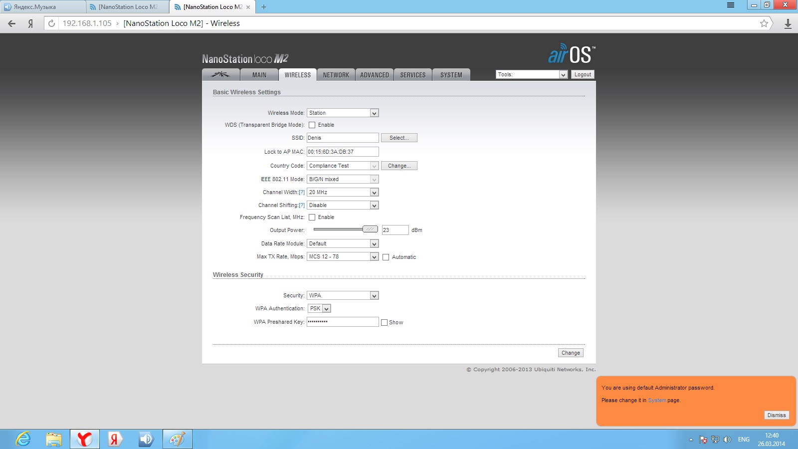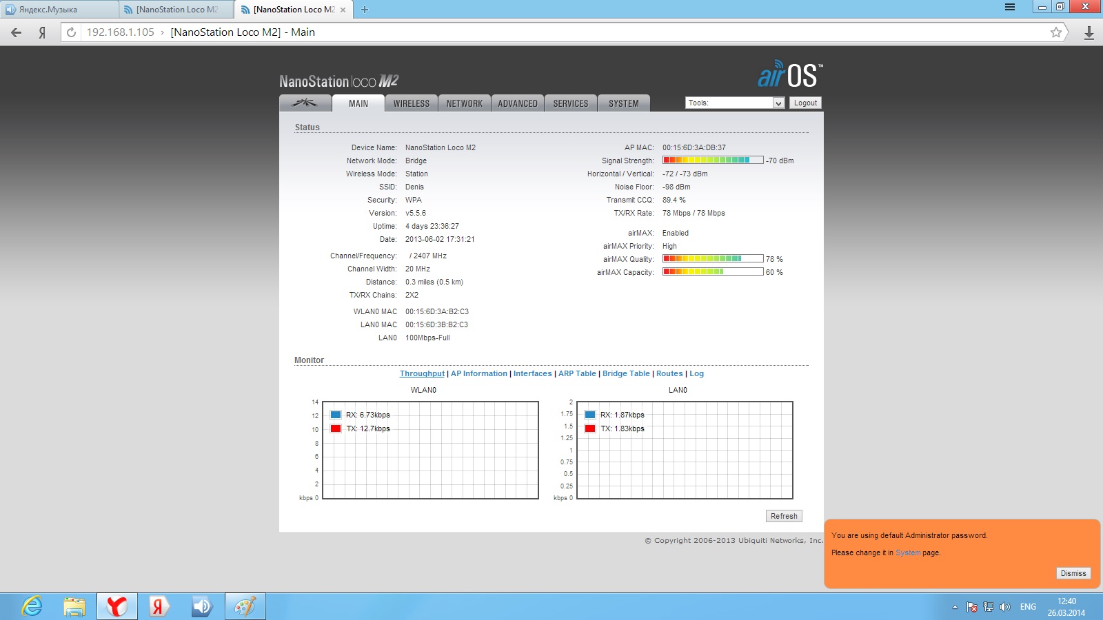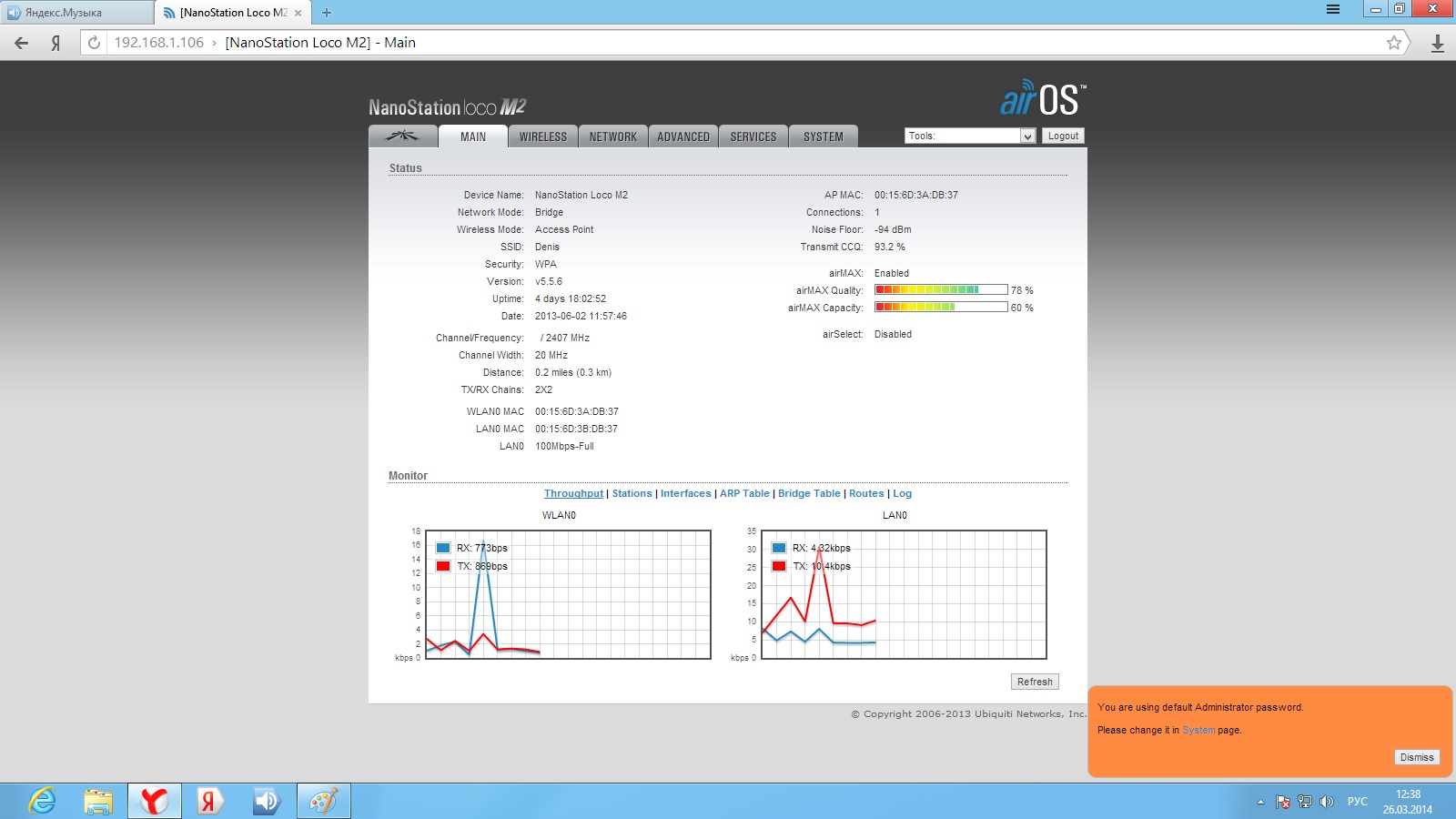 Pitanga Posted March 26, 2014 Posted March 26, 2014 День добрый! есть 2 nanostation loco m2. первая стоит на пятиэтажке и раздает интернет на вторую точку, которая стоит на мачте в частном доме (расстояние 300 метров, прямая видимость есть). До сегодняшнего момента все было гуд, скорость инета на входе была 20 м/бит (на вторую точку раздавалось также 20 м/бит). перешел на другой тариф 40 м/бит (на второй точке так 20 и осталось). решил полазить в настройках точек, в итоге что то нахимичил теперь скорость на выходе второй точке дай бог до 3 м/бит доходит. что делать не пойму как поднять скорость до 40. извините за такую белеберду, но как то так. Скрины настроек прилагаю Вставить ник Quote