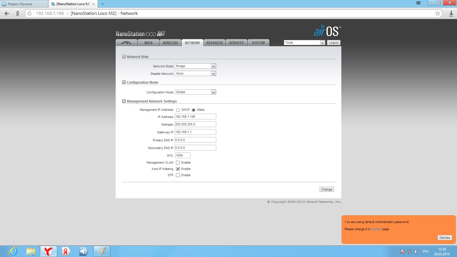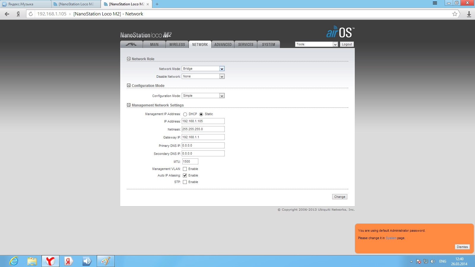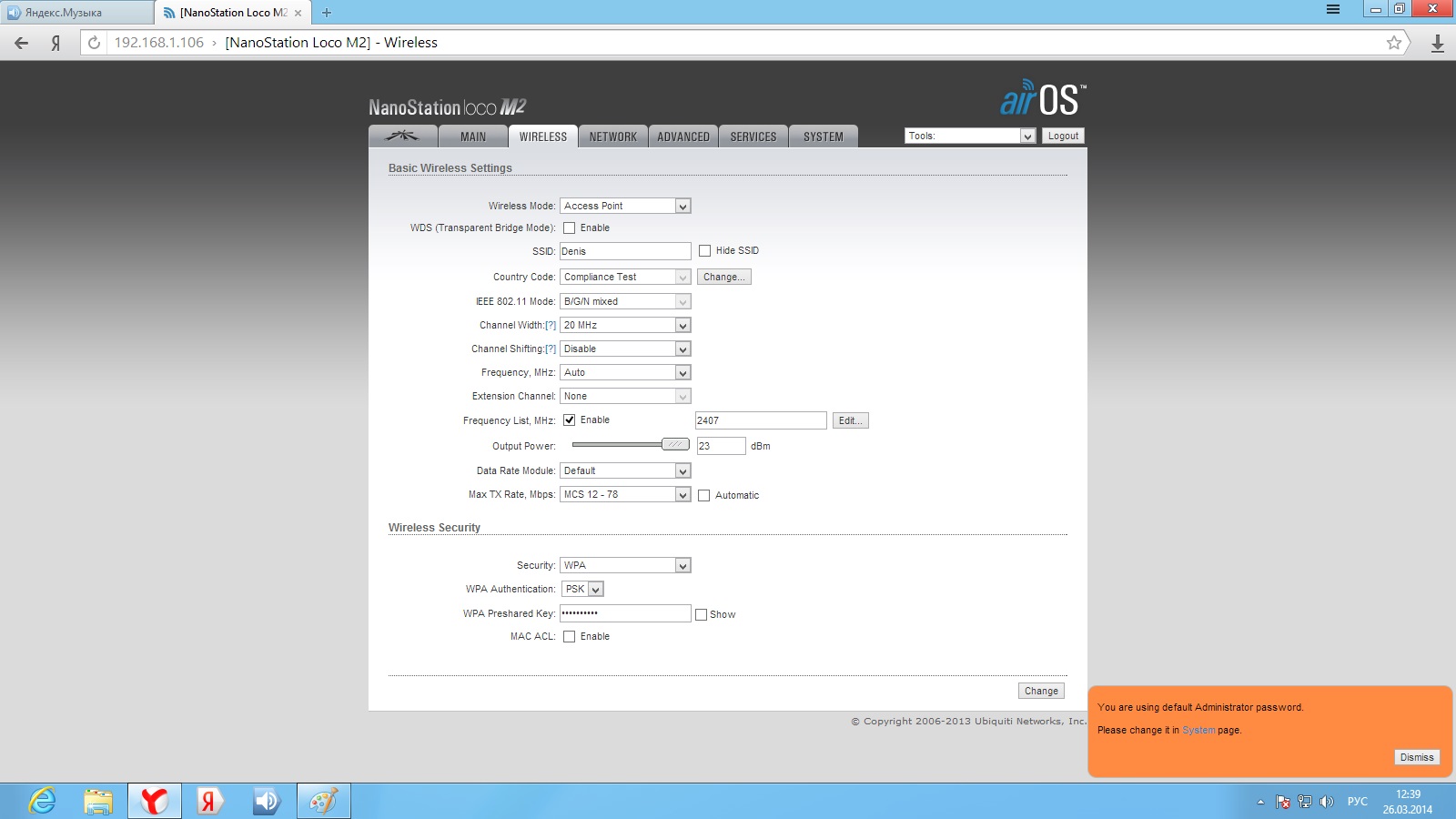 Pitanga Posted March 26, 2014 Posted March 26, 2014 День добрый! есть 2 nanostation loco m2. первая стоит на пятиэтажке и раздает интернет на вторую точку, которая стоит на мачте в частном доме (расстояние 300 метров, прямая видимость есть). До сегодняшнего момента все было гуд, скорость инета на входе была 20 м/бит (на вторую точку раздавалось также 20 м/бит). перешел на другой тариф 40 м/бит (на второй точке так 20 и осталось). решил полазить в настройках точек, в итоге что то нахимичил теперь скорость на выходе второй точке дай бог до 3 м/бит доходит. что делать не пойму как поднять скорость до 40. извините за такую белеберду, но как то так. Скрины настроек прилагаю Вставить ник Quote