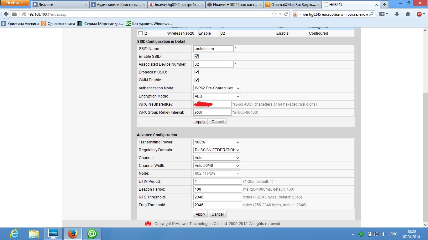 Кристиночка Posted April 7, 2014 Имеется модем Huawei hg8245. Не могу подключиться к Wi fi ни с телефона, ни с ноута...причем к сети он подключается, а интернет не загружается..сигнал хороший. Через кабель подключаю-все работает. Настраивала через web интерфейс, под диктовку провайдера...все вроде верно Вставить ник Quote Ответить с цитированием Share this post Link to post Share on other sites More sharing options...