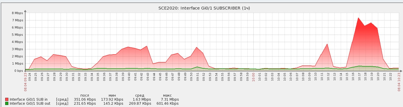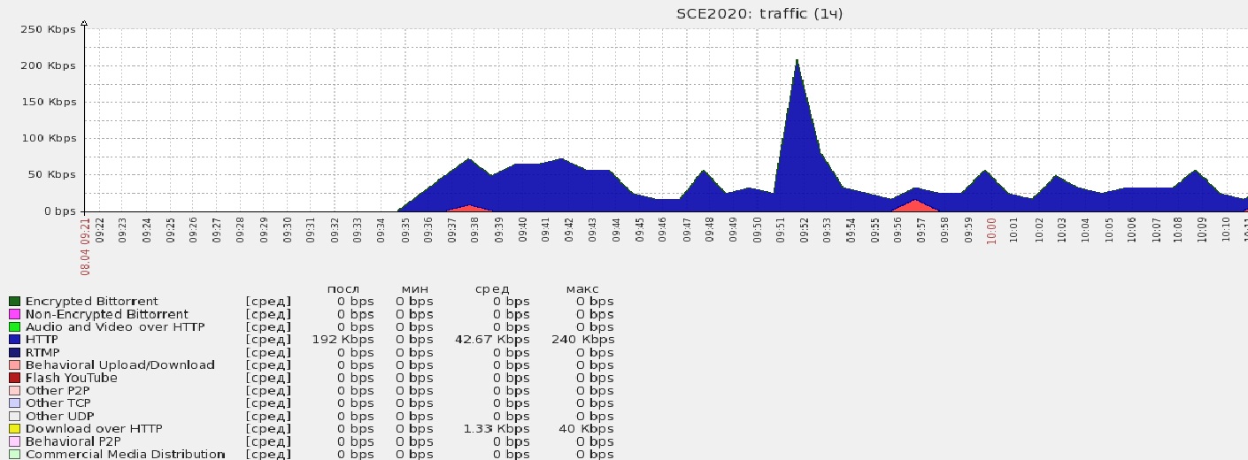 ARTIsshoque Posted April 8, 2014 Posted April 8, 2014 (edited) Добрый день. Используется следующая система: System Cisco Service Control, SW version: Version 4.0.0-classic Build 316, HW version: SCE2000 4xGBE Platform Cisco Service Control, SW version: Version 4.0.0-classic Build 316, HW version: SCE2000 4xGBE Mgmt Agent Version SCE Agent 4.0.0 Build 115 SML App Version Engage SML Version 4.0.0 build 65 (Protocol Pack 38 build 34) Using Lib - PL_V4.0.0PP_B111;Using Lib - Classifier_V4.0.0_B111 Last PQI Installed Operation: Install; Package: SCA BB 4.0.0 build 81 Configuration SCE2000 Hostname SCE2000 Traffic Processing Started Split Flow Mode Disabled Policy Mode Full Functionality SCE Connection-Mode Inline Virtual Link Mode Disabled Заметили, что счётчики по типам трафика ведут неправильный учёт. К примеру, за сутки через torrent скачали более 10 Гб, а счётчик показывает 8595 для шифрованного bittorrent и 185614 для нешифрованного (счётчики смотрим по SNMP). В документации указано, что счётчики ведут учёт в килобайтах. Выкладываю пару графиков, чтобы проиллюстрировать разницу в реальной загрузке интерфейса и показаниях счётчиков трафика. Что посоветуете для решения проблемы? Имеет ли смысл откатиться на более старую версию софта, или наоборот поставить более свежий protocol pack? (Кстати, буду благодарен тому, кто поделится PP 40) Edited April 9, 2014 by ARTIsshoque Вставить ник Quote