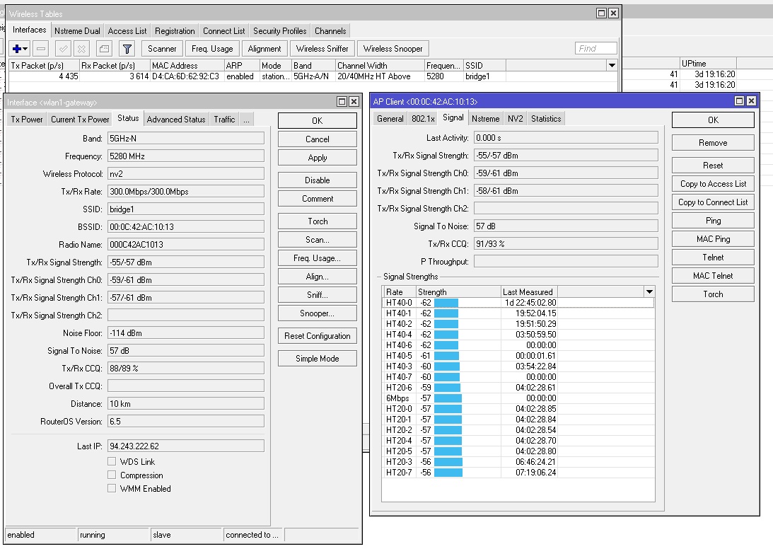 Saab95 Posted April 18, 2014 Posted April 18, 2014 Скорость показывает 200-300 Мбит/с. А спид тест показывает 80-90... Начните с того, что Guard Interval поставьте в значение Long, убавьте мощность и для проверки включите Nstreme, упадет задержка и сможете прокачивать больше по спидтесту. Так же не забудьте прошивку обновить до 6.10 и в консоли: /ip firewall connection tracking set enabled=no /queue type set 1 pfifo-limit=1000 set 2 kind=pfifo pfifo-limit=1000 Вставить ник Quote
