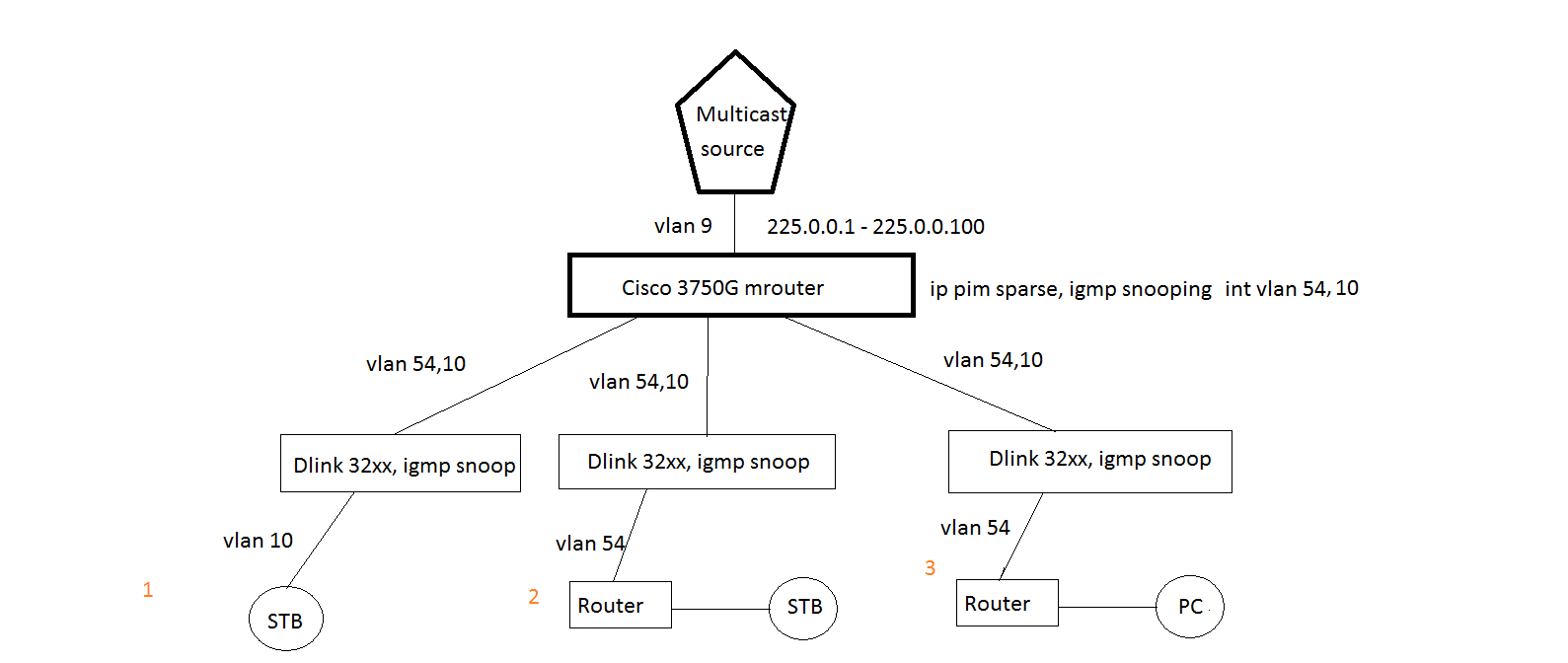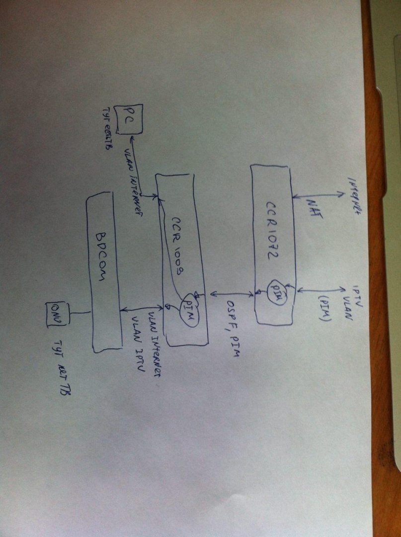 Serg777 Posted February 16, 2018 Доброго дня всем. столкнулся с такой проблемой как на BDCOM 3310C заставить работать мультикаст схема такая имееться влан от поставщика контента с PIM принимаем на микротик CCR1072 тоже с поднятым PIM далее сеть на OSPF отдаем через PIM на другой микротик и там тоже естественно поднимаем PIM на нем поднимаем VLAN включаем его в PIM и отдаем на станцию уже в влан на юзеров картинки нема при этом всём если на этом микротике подключаю в PIM интерфейс с компом то VLC показывает то есть контент доходит Share this post Link to post Share on other sites More sharing options...