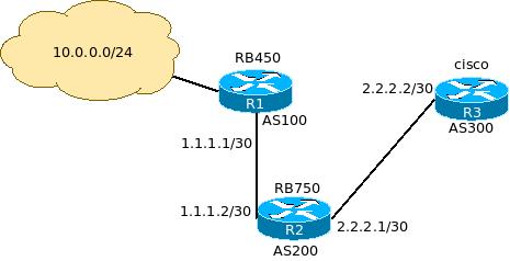shuu01 Posted May 5, 2014 Posted May 5, 2014 (edited) Есть небольшой вопрос по принципам работы bgp as-override в микротиках. Вот типовой конфиг, на рисунке схема подключения: RB450 AS100 /routing bgp instance name="default" as=100 router-id=1.1.1.1 redistribute-connected=yes redistribute-static=yes redistribute-rip=no redistribute-ospf=no redistribute-other-bgp=no out-filter="" client-to-client-reflection=no ignore-as-path-len=no routing-table="" /routing bgp peer name="RB750" instance=default remote-address=1.1.1.2 remote-as=200 tcp-md5-key="" nexthop-choice=default multihop=no route-reflect=no hold-time=15s ttl=default in-filter=RB750_in out-filter=RB750_out address-families=ip default-originate=never remove-private-as=no as-override=yes passive=no use-bfd=no /routing filter chain=RB750_out prefix=0.0.0.0/0 prefix-length=16-32 invert-match=no action=accept set-bgp-prepend-path="" chain=RB750_in prefix=0.0.0.0/0 prefix-length=16-32 invert-match=no action=discard set-bgp-prepend-path="" chain=RB750_in prefix=0.0.0.0/0 invert-match=no action=accept set-bgp-weight=300 set-bgp-prepend-path="" RB750 AS200 /routing bgp instance name="default" as=200 router-id=2.2.2.1 redistribute-connected=yes redistribute-static=yes redistribute-rip=no redistribute-ospf=no redistribute-other-bgp=no out-filter="" client-to-client-reflection=no ignore-as-path-len=no routing-table="" /routing bgp peer name=RB450 instance=default remote-address=1.1.1.1 remote-as=100 tcp-md5-key="" nexthop-choice=default multihop=no route-reflect =no hold-time=15s ttl=default in-filter=RB450_in out-filter=RB450_out address-families=ip default-originate=always remove-private-as=no as-override=yes passive=no use-bfd=no name=cisco instance=default remote-address=2.2.2.2 remote-as=300 tcp-md5-key="" nexthop-choice=default multihop=no route-reflect=no hold-time=15s ttl=default in-filter=cisco_in out-filter=cisco_out address-families=ip default-originate=never remove-private-as=no as-override=yes passive=no use-bfd=no /routing filter chain=RB450_in prefix=0.0.0.0/0 prefix-length=16-32 invert-ma tch=no action=accept set-bgp-prepend-path="" chain=RB450_out prefix=0.0.0.0/0 prefix-length=16-32 bgp-as-path= ^300,.*$ invert-match=no action=discard set-bgp-prepend-path="" chain=RB450_out prefix=0.0.0.0/0 prefix-length=16-32 invert-match =no action=accept set-bgp-prepend-path="" chain=cisco_in prefix=0.0.0.0/0 prefix-length=24-32 invert-match=no action=accept set-bgp-prepend-path="" chain=cisco_out prefix=0.0.0.0/0 prefix-length=24-32 invert-match=no ac tion=accept set-bgp-prepend-path="" cisco as=300 router bgp 300 neighbor 2.2.2.1 remote-as 200 address-family ipv4 no synchronization bgp redistribute-internal neighbor 2.2.2.1 activate neighbor 2.2.2.1 default-originate neighbor 2.2.2.1 distribute-list ournet_10 in neighbor 2.2.2.1 distribute-list ournet_10 out ip access-list standard ournet_10 deny 10.72.0.0 0.0.255.255 permit 10.0.0.0 0.255.255.255 В итоге наблюдаю на циске немного не то, что ожидал по документации as-override: core#sh ip bgp 10.0.0.0 BGP routing table entry for 10.0.0.0/24, version 603339 Paths: (1 available, best #1, table default) Multipath: eBGP Advertised to update-groups: 36 38 75 84 96 200 100 2.2.2.1 from 2.2.2.1 (2.2.2.1) Origin incomplete, localpref 100, valid, external, best core#sh ip bgp | inc 10.0.0.0 *> 10.0.0.0/24 2.2.2.1 0 200 100 ? а именно полный as-path до конечной точки. Что не так? Edited May 5, 2014 by shuu01 Вставить ник Quote