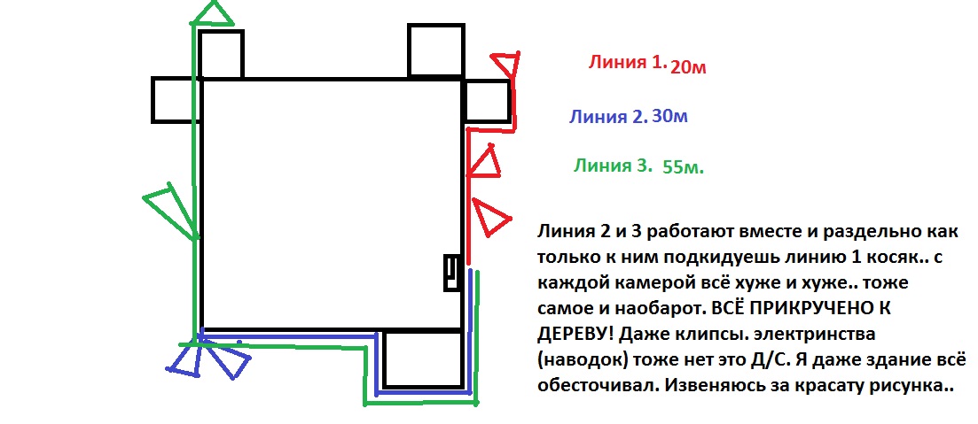 expert01 Posted May 18, 2014 Posted May 18, 2014 Доброго времени суток Уважаемый читатель!! Хочу поделится своим горем надеясь на твою помощь.. Вообще объясняю есть некий детский садик квадратной формы, кирпичный, одноэтажный с деревянной крышой. У меня идут 3 линии две в лево одна в право. Длинны кабелей 1-я левая 30м.(две камеры) 2-я левая 60м.(две камеры) правая 25м.(три камеры) проложено витой парой, с использованием усилителей, в гофре, на клипсах, прикручено к низу деревяной крыши, без использования перфоратора, камеры так-же прикручены к деревянной крыше, с электричеством не пресекается. Что происходит: при подключении к регистратуру отдельной одной линии например правой всё показывает отлично, при подключении отдельно правой тоже всё шоколадно показывает, а когда подключаешь обе линии одновременно самая ближняя камера начинает моргать некоторые темнеют некоторые показывают с помехами, а три штуки на разных линиях показывают нормально, вообщем какая-то хрень!! Что я только не делал... Щас перечислю: 1. Заземлял камеры. 2. Заземлял регистратор. 3. Заземлял блоки питания. 4. Подкидывал всю систему только на акб. 5. Обесточивал всё здание (думал может наводки(ну а какае могут быть наводки в детском садике?)). 6. Прокладывал отдельный провод до камер как до первой так и до последней. 7. Поменял РЕГИСТРАТОР на другой. Во общем делал всё что можно сделать. Ни чего не помогло... Всё так и осталось или левая работает чётко или правая, вмести не в какую!!!! У меня есть тестер для камер с монитором на нём всё отлично показывает и вольтаж правильный приходит (мерял возле рега.)! Короче я опустил руки.... Это первый объект (а сделал я их очень много (причём на этом-же оборудовании) на котором я не знаю что мне делать... Если сталкивались с таким полтергейстом поделитесь что это может быть?!?!?!?!? Оборудование такое: всё фирмы Jassun 1. JSR-L0803 Видео регистратор Jassun; Pentaplex Метод компрессии: H.264 Видео входы: 8xBNC Видео выходы: BNC/VGA Сквозные каналы: —Аудио входы / выходы: 8xRCA / 1xRCA Тревожные входы / выходы: 1 вх. 2. JSA-X1000IRU 3.6mm 3. HDD 1000 Gb Seagate (7200) SATAIII, 32Mb cache 4. Блок резервного питания ТР12-4/7, 4А, 12В (В боксе для АКБ 7а/ч или 12а/ч) (2шт. один на камеры другой на регистратор) 5. Монитор ЖК AOC Value Line E2250SWDNK, 21.5", черный (10130192/280114/0000727/6, КИТАЙ) 6. TP-C/2 Приемопередатчик пассивный, 1-канальный по витой паре CAT 5e. Разъем BNC / разъем для подключения витой пары под клемму. Передача видеосигнала по кабелю витой паре CAT5e: ч/б сигнала - на 600 м. 7. Разъем питания универсальный "папа" VW-1 В ЗАРАНЕЕ ОГРОМНОЕ СПАСИБО!!!!!!!!!!!!! Вставить ник Quote