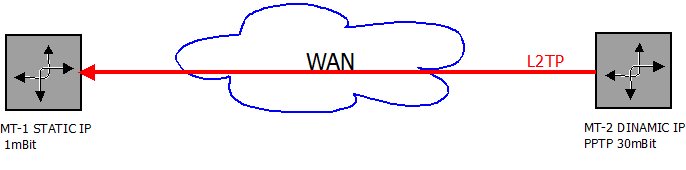 z36 Posted June 10, 2014 Posted June 10, 2014 Есть две точки включения, стоят RB951G, за каждым домашняя локалка. На первой точке MT-1 белый статический ИП, скорость 1мБит. На второй точке МТ-2 белый динамический ИП, скорость 30 мБит, PPTP через серую локалку провайдера. Провайдеры разные, но между собой скорость не режут, хочется получить инет на МТ-1 через МТ-2. Настраивал маскарадинг на МТ-2 и поднимал L2TP до МТ-1, на МТ-1 маршрут 0.0.0.0 на входящее L2TP, но траффик не идеть. Пробовал и МТ-2 делать сервером, тоже не идеть, а если с компа поднять L2TP до МТ-2, то идеть. Есть возможность и на МТ-2 взять статику. Бьюсь уже вторую неделю, не могу разобраться, подскажите принцип действия такой схемы, надо ли маркировать траффик или может политиками роутинга разруливать. Версия ОС 6.13. Вставить ник Quote