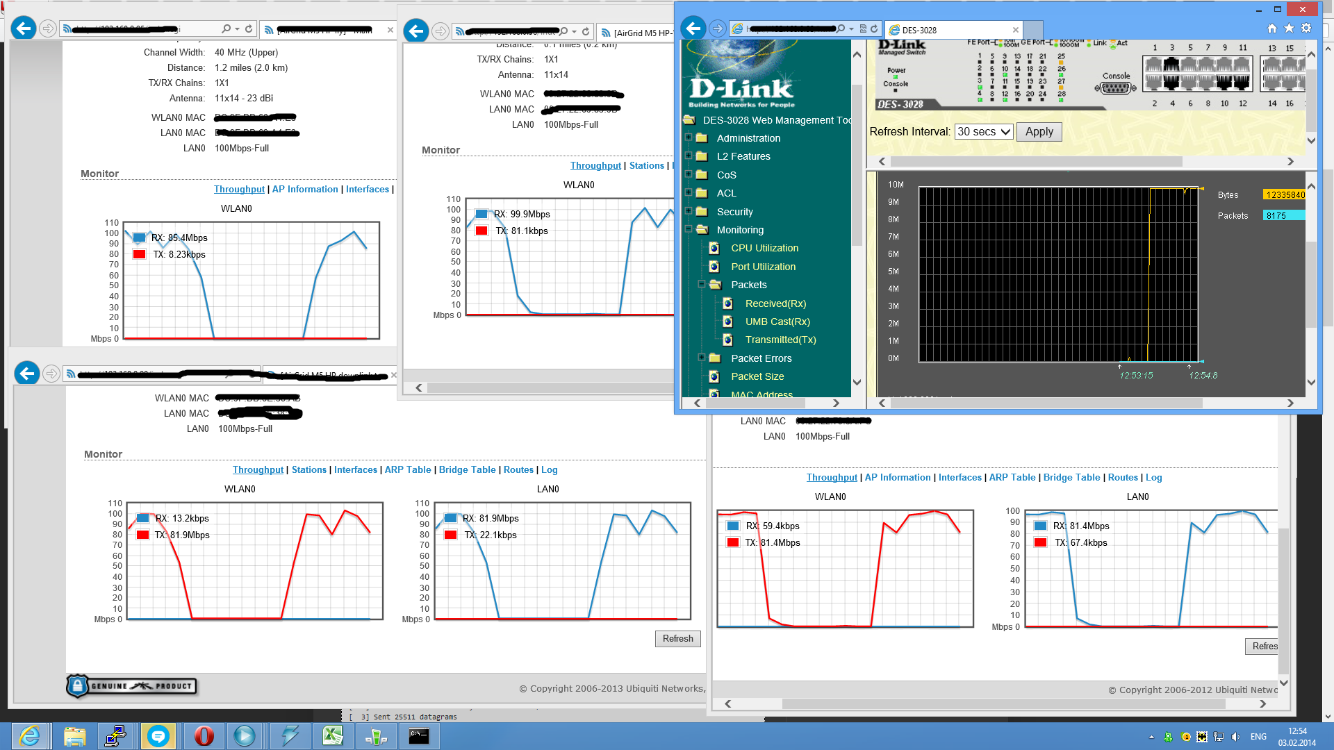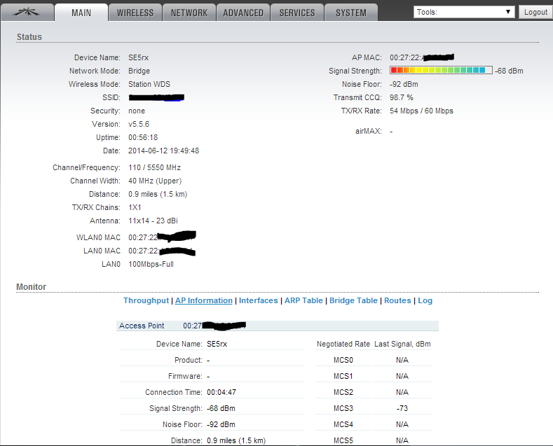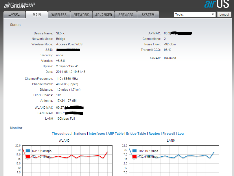 seventh Posted June 12, 2014 Posted June 12, 2014 Здравствуйте, уважаемые! Имеем один AirGrid M5HP в качестве AP (192.168.9.8) и два клиента (192.168.9.3 и ещё один). Основной трафик идёт через 9.3 - за ним есть ещё радио (2,4), около 30 клиентов, торренты и всё сопутствующее. Проблема в том, что этот мост 9.8-9.3 не прокачивается более чем на 20 Мбит/с, но и при приближении к этой цифре пинги сильно увеличиваются, и даже веб-сёрфинг становится невозможным. Расстояние около 2 км., отключение второй, лишней точки не помогает. Клиент: База: Местоположение - посёлок, сканом других точек на 5 Ггц не находится и, я думаю, вряд ли они будут. Ну и частотами игрались. Что делаем не так? Заранее благодарю! Ещё информация с 9.3 - не слишком ли большой pps? TX/RX Rate: 60.0 Mbps / 60.0 Mbps TX/RX Bit Rate: 946.89 kbps / 12.34 Mbps TX/RX Packets: 260243 / 315012 TX/RX Packet Rate, pps: 1164 / 1488 Вставить ник Quote