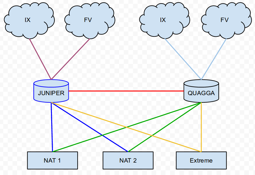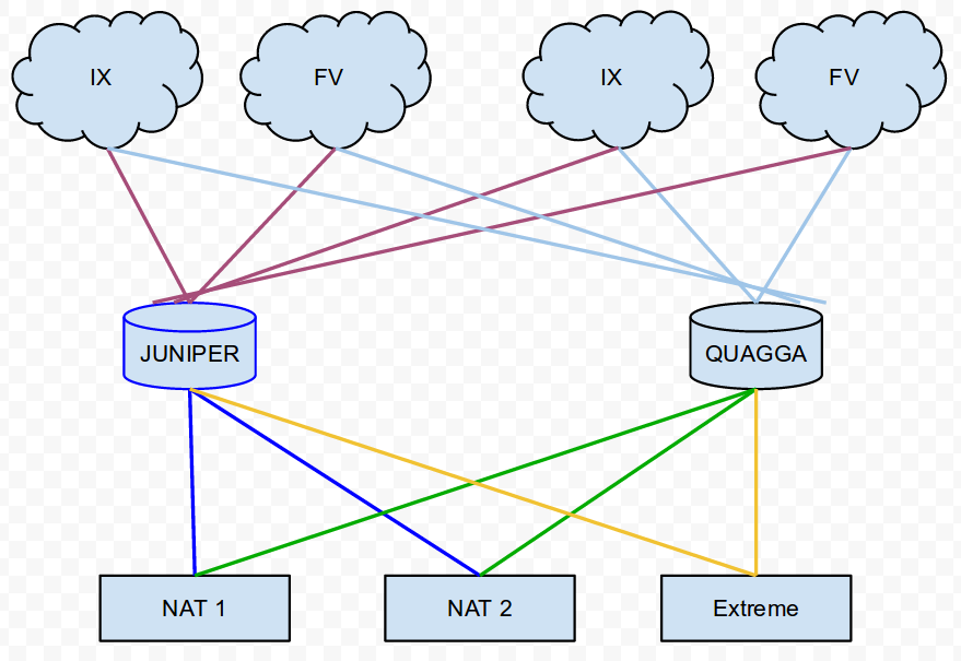 killonik Posted August 8, 2014 Всем доброго дня. Имеем подключение к нескольким IX и нескольким FV. Сейчас все они подключены к одному бордеру, который в данный момент и собираемся резервировать. Этот бордер отдаёт дефолт нескольким НАТ на LINUX и одному Extreme x670, через который бегают абоненты с внешними IP. Очевидно, что для полноценного резервирования, аплинков надо поделить между существующим бордером и новым так, чтобы к каждому были подключены и IX и FV. В идеале получить от каждого провайдера адрес для резервного BGP. Чтобы схема выглядела так: Но до этого момента ещё далеко и провайдеры если и выдадут дополнительный адрес, то не все и не сразу. Поэтому пока думаем поделить провайдеров между бордерами как было сказано выше, но сразу видим проблемку: НАТы легко получат FV от обоих бордеров, а вот Extreme не потянет даже один FV. Получается что надо отдавать ему два дефолта с разным приоритетом и соединять бордеры между собой для того, чтобы трафик с Extreme мог дойти до IX подключенного к другому бордеру, а не в FV. Схема получается такая: По-хорошему наверно надо с каждого бордера на Extreme отдать маршруты до IX(должны поместиться) c максимальным приоритетом, и два дефолта с разным приоритетом. Тогда не весь трафик от внешников будет ходить через один дефолтный BGP. Просьба, кто сталкивался с подобной ситуацией, поделиться знаниями о подводных камнях или поправить, если мы что-то не так себе представляем. Share this post Link to post Share on other sites More sharing options...