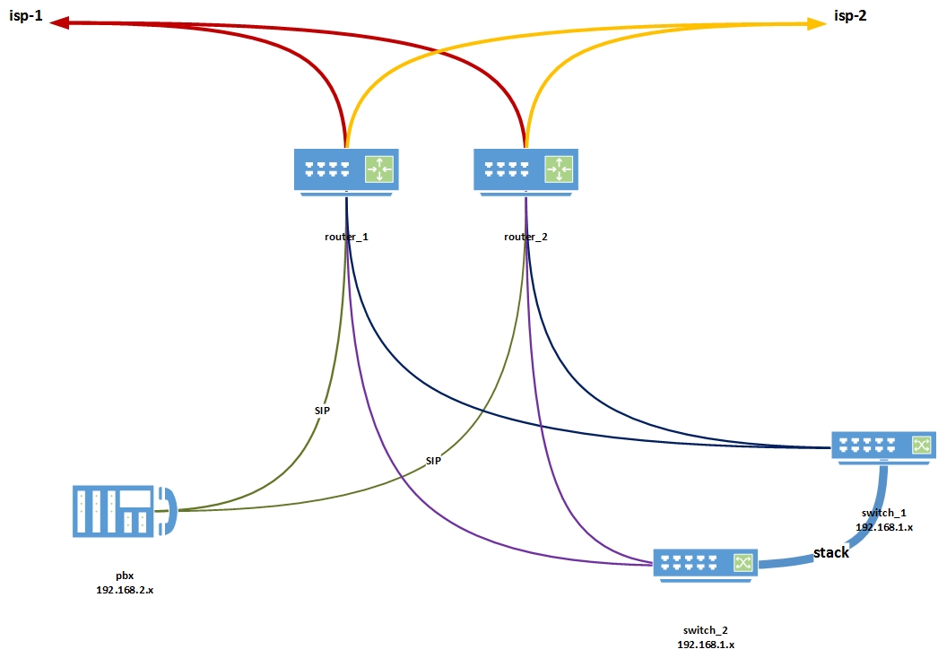 ega0 Posted August 11, 2014 Posted August 11, 2014 Всем доброго времени суток! Имеется в наличии: 2 провайдера (одинаковая скорость у каждого) 2 одинаковых роутера 2 одинаковых свича VLAN не используется обмен данными между сетями 192.168.1.x и 192.168.2.x закрыт Цель: настроить отказоустойчивую связь через 2 провайдеров с использованием VRRP и с учётом использования SIP. В итоге желаемое построение сети будет выглядеть, как на приложенной схемке (извиняюсь за радужные цвета). Необходимо: Делить канал поровну – решил добавлением gw второго провайдера. Данное решение верно? Что делать с DNS провайдеров если к примеру, связь будет, а DNS сервер ляжет? Я так понимаю прописать необходимо адреса DNS серворо обеих провайдеров с чередованием? Как будет вести себя NAT, а именно проброс портов (извне во внутреннюю сеть)? Что делать с SIP (пожайлуй главный вопрос)? Проверено: в конфигурации только с одним роутером (без VRRP) при отключении одного из роутеров трафик заворачивается на оставшегося провайдера, но соединения остаются висеть. Решение, которое предлагали на одном из сайтов, написание скрипта со сбросом /ip firewall connection tracking проверил вручную – не сработало (подозреваю, что не правильно проверял). Кроме того, была ситуация, при которой гейт первого провайдера был доступен, но дальше беда – за ним все маршруты (маршруты провайдера) слетели. Получается, что роутер продолжал заворачивать часть трафика на первого провайдера и соответственно у части пользователей не было интернета. Какие средства помогают при таких обстоятельствах? Вставить ник Quote