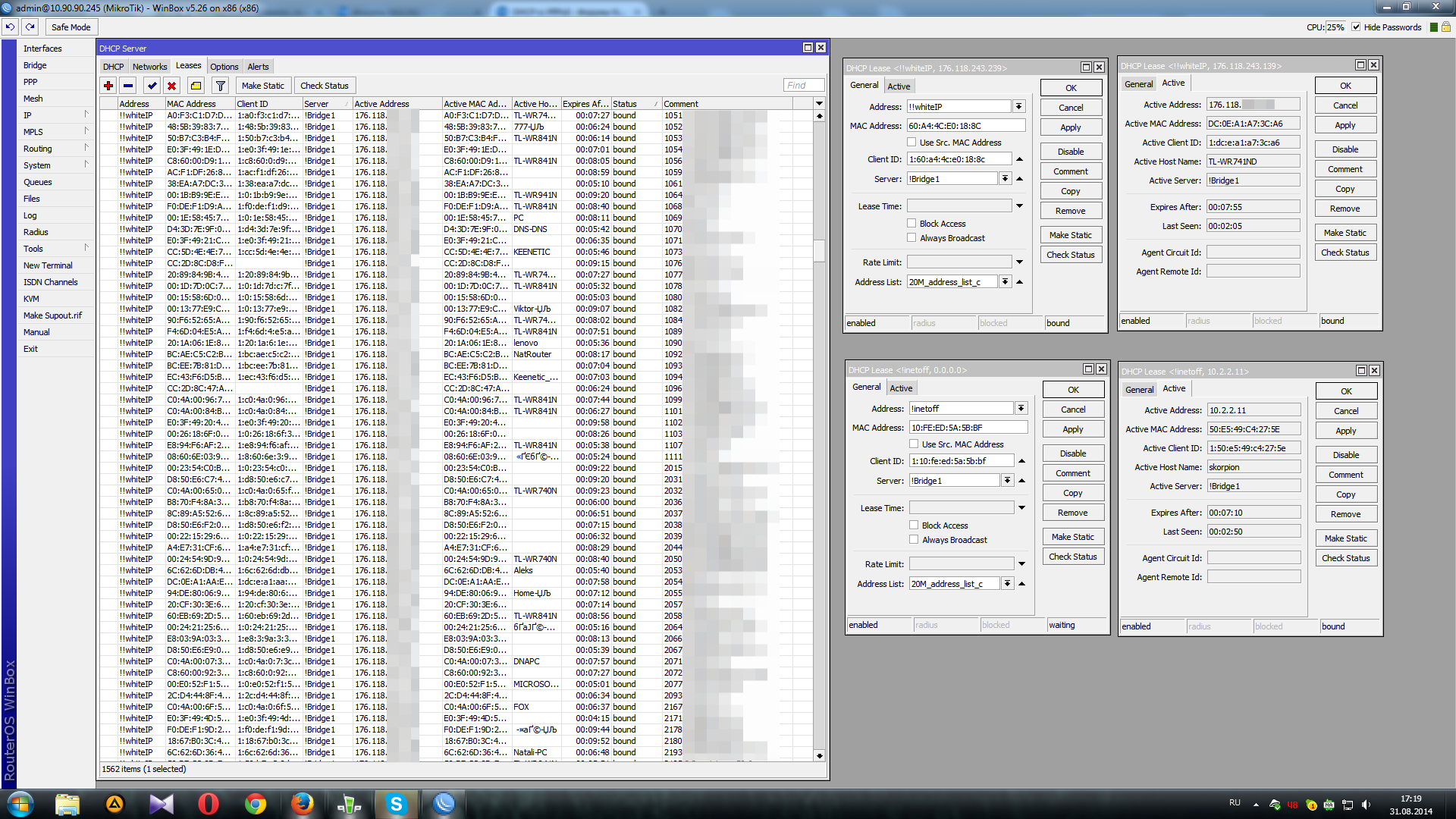 AKim Posted August 31, 2014 Posted August 31, 2014 У нас в сети IPoE используется с привязкой к маку. Так вот, по моему мнению привязка к маку проще и лучше, чем pppoe. Плюс PPPoE - есть логин пароль, который нужно только ввести в оборудование Минус - это ошибки, которые могут возникать при подключении. Плюс IPoE с привязкой к МАКу - нет никаких настроек, всё автоматически Минус - сама привязка к МАКу А вот простота настройки PPPoE в отличии от привязки к МАКу - это двояко. У нас 1500 клиентов и настроить любой вид подключения для них проблема. Звонят в любом случае. Только в случае с IPoE и МАКом, переписать мак дело одной минуты, а объяснить как настроить PPPoE подключение в роутере уже проблема. 2)Проще работа с IP пулами: адреса раздаются разным BRAS'ам, в разных VLAN'ах, из одних и тех же пулов. Мы отдаём белые динамические адреса через DHCP с привязкой к МАКу. Есть 3 пула Unknown - серый пул, который выдаётся всем по умолчанию. На нём переадресация на заглушку с сообщением о незарегистрированном устройстве. whiteIP - белый пул адресов, который выдаётся статическим Leases inetoff - серый пул, который выдаётся абонентам при отключении за неуплату. На нём тоже заглушка. Вставить ник Quote