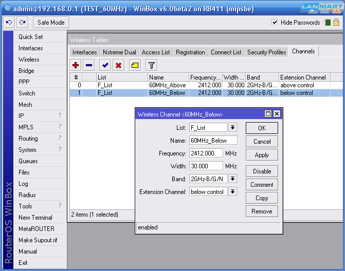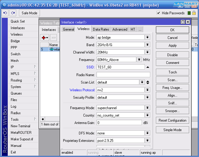 Saab95 Posted September 3, 2014 Posted September 3, 2014 Две точки мост микротик G-2Hnd установил Router OS 6.18, купил две лицензии на два устройства настроил все как на ланмарте написано после настройки канальные скорости точек стали 195/195 менял частоты и мощность но больше не поднимается .Условия идеальные прямая видемость и маленькое расстояние 500 метров.Без установки лицензий канальные скорости 270/270 130 + 65 = 195 - вы видимо забыли при настройке канала для работы выбрать дополнительный канал, или указали не верные значения с обоих сторон, поэтому сейчас работает в полосе 30мгц а не 60. Вставить ник Quote