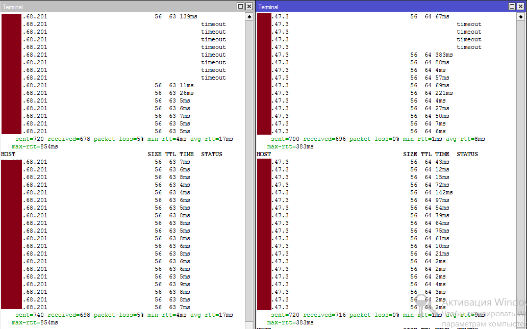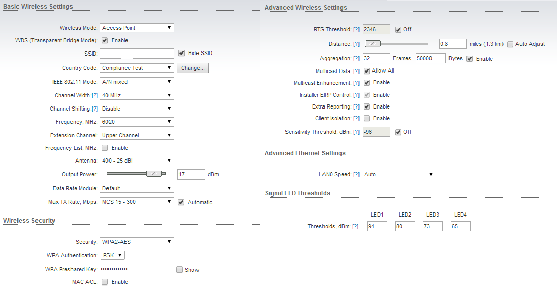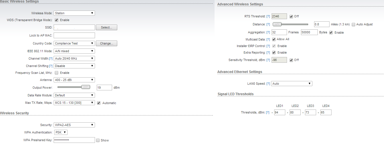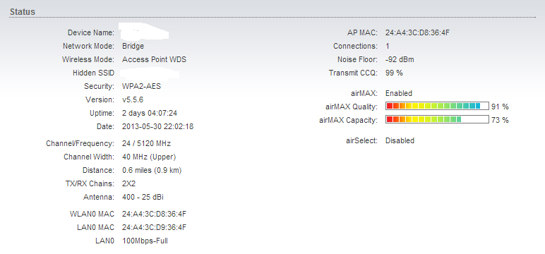 mirex Posted September 6, 2014 Author Posted September 6, 2014 (edited) Через 12 часов ничего не изменилось. Что было испробовано: 1) Изменение частот, согласно airview, перепробовал 5-6 каналов; 2) Заменены головки бриджей на новые; 3) Проставлены ACK вручную; 4) Переобжаты все коннекторы; 5) Изменена ширина канала с 40МГц на 20Мгц; 6) На всякий случай изменен ssid. Проблема осталась, хаотично проваливается линк: возрастают пинги, пакеты валятся. Само это явление краткосрочное 3-8с, потом все снова нормально. Возникать может хоть каждые 5 минут, может быть раз в 2 часа. Т.е. зависимости никакой не вижу. В чем дело так и не понятно. Ещё смущает плавающий TX/RX в стейшен лист на AP. На скрине видно 270/240, он постоянно плавает 240/240, 270/270. Хотя с таким показателями должен быть 300/300 Edited September 6, 2014 by mirex Вставить ник Quote
