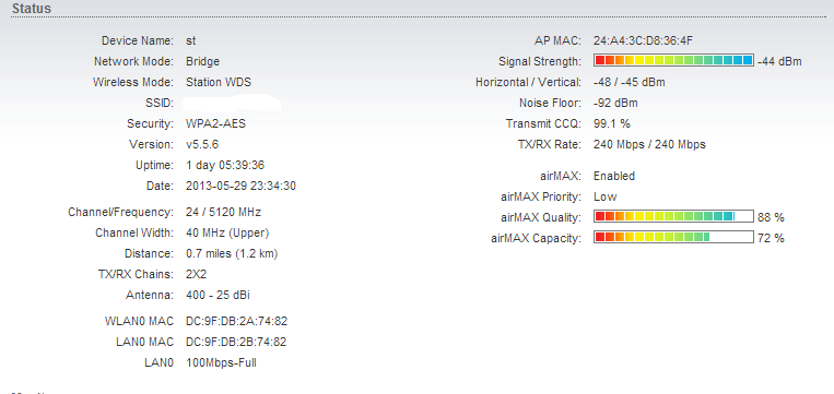 mirex Posted September 5, 2014 Posted September 5, 2014 (edited) Прошу помощи, потому что сам уже сломал голову, что за ерунда. Расстояние между точками 1км, абсолютно прямая видимость. Схема сети следующая: провайдер -> AP NanoBridge M5-400 (x.x.47.3) -> Station NanoBridge M5-300 (x.x.47.4) - > Mikrotik RB 2011 Линк работал исправно 1,5 года, и неделю назад началось...Все вроде работает , но иногда начинают подскакивать пинги, пакеты могут теряться. Причем по времени это хаотично, заметил, что ночью практически не бывает. От нагрузки конечно пинги повышаются, но допустим пропускаю я по мосту 50Мбит/с дуплекса, пинг повышается до 30-40мс, но ничего не теряется. А в ситуации, которую я наблюдаю нагрузка может быть 1Мбит/с - и пакеты потерялись. Частоты менял, полосу менял с 40 на 20Мгц, мощность понижал - все равно наблюдается проблема. Пошел на отчаяный шаг, заменил обе головки бриджей на новые(без переноса самих бриджей) - все равно проблема наблюдается. Думаю может где то коннектор окислился. Такое возможно? Скрины с AP, station, пинги с микротика прилагаю. Логи staion May 28 17:55:17 system: Start May 28 17:55:18 FileSystem: Start check... May 28 17:55:35 FileSystem: End check. May 29 06:23:03 system: Stop May 29 06:23:17 system: Start May 29 06:23:17 syslogd started: BusyBox v1.11.2 May 29 06:23:17 dropbear[2835]: Not backgrounding May 29 06:23:18 wireless: ath0 Set Mode:Managed May 29 06:25:41 wpa-supplicant: Trying to associate with 24:a4:3c:d8:36:4f (SSID='ed_bridge_odo' freq=5120 MHz) May 29 06:25:41 wireless: ath0 Set Mode:Managed May 29 06:25:41 wireless: ath0 Set Frequency:5.12 GHz (Channel 24) May 29 06:25:41 wireless: ath0 New Access Point/Cell address:24:A4:3C:D8:36:4F May 29 06:25:41 wpa-supplicant: Associated with 24:a4:3c:d8:36:4f May 29 06:25:41 wpa-supplicant: WPA: Key negotiation completed with 24:a4:3c:d8:36:4f [PTK=CCMP GTK=CCMP] May 29 06:25:41 wpa-supplicant: CTRL-EVENT-CONNECTED - Connection to 24:a4:3c:d8:36:4f completed (auth) [id=0 id_str=] May 29 07:05:53 wpa-supplicant: WPA: Group rekeying completed with 24:a4:3c:d8:36:4f [GTK=CCMP] May 29 08:05:53 wpa-supplicant: WPA: Group rekeying completed with 24:a4:3c:d8:36:4f [GTK=CCMP] May 29 09:05:53 wpa-supplicant: WPA: Group rekeying completed with 24:a4:3c:d8:36:4f [GTK=CCMP] May 29 10:05:53 wpa-supplicant: WPA: Group rekeying completed with 24:a4:3c:d8:36:4f [GTK=CCMP] May 29 11:05:53 wpa-supplicant: WPA: Group rekeying completed with 24:a4:3c:d8:36:4f [GTK=CCMP] May 29 12:05:53 wpa-supplicant: WPA: Group rekeying completed with 24:a4:3c:d8:36:4f [GTK=CCMP] May 29 13:05:53 wpa-supplicant: WPA: Group rekeying completed with 24:a4:3c:d8:36:4f [GTK=CCMP] May 29 14:05:53 wpa-supplicant: WPA: Group rekeying completed with 24:a4:3c:d8:36:4f [GTK=CCMP] May 29 15:05:53 wpa-supplicant: WPA: Group rekeying completed with 24:a4:3c:d8:36:4f [GTK=CCMP] May 29 16:05:53 wpa-supplicant: WPA: Group rekeying completed with 24:a4:3c:d8:36:4f [GTK=CCMP] May 29 17:05:53 wpa-supplicant: WPA: Group rekeying completed with 24:a4:3c:d8:36:4f [GTK=CCMP] May 29 18:05:53 wpa-supplicant: WPA: Group rekeying completed with 24:a4:3c:d8:36:4f [GTK=CCMP] May 29 19:05:53 wpa-supplicant: WPA: Group rekeying completed with 24:a4:3c:d8:36:4f [GTK=CCMP] May 29 20:05:53 wpa-supplicant: WPA: Group rekeying completed with 24:a4:3c:d8:36:4f [GTK=CCMP] May 29 20:12:09 wpa-supplicant: CTRL-EVENT-DISCONNECTED - Disconnect event - remove keys May 29 20:12:09 wireless: ath0 Received deauth from 24:a4:3c:d8:36:4f. Reason: Unspecified (1). May 29 20:12:09 wireless: ath0 New Access Point/Cell address:Not-Associated May 29 20:13:00 wireless: ath0 Scan request completed May 29 20:13:56 wireless: ath0 Scan request completed May 29 20:13:56 wpa-supplicant: Trying to associate with 24:a4:3c:d8:36:4f (SSID='ed_bridge_odo' freq=5120 MHz) May 29 20:13:56 wireless: ath0 Set Mode:Managed May 29 20:13:56 wireless: ath0 Set Frequency:5.12 GHz (Channel 24) May 29 20:13:56 wireless: ath0 New Access Point/Cell address:24:A4:3C:D8:36:4F May 29 20:13:56 wpa-supplicant: Associated with 24:a4:3c:d8:36:4f May 29 20:13:56 wpa-supplicant: WPA: Key negotiation completed with 24:a4:3c:d8:36:4f [PTK=CCMP GTK=CCMP] May 29 20:13:56 wpa-supplicant: CTRL-EVENT-CONNECTED - Connection to 24:a4:3c:d8:36:4f completed (reauth) [id=0 id_str=] May 29 21:12:24 wpa-supplicant: WPA: Group rekeying completed with 24:a4:3c:d8:36:4f [GTK=CCMP] May 29 21:35:12 init: process '/bin/lighttpd -D -f /etc/lighttpd.conf' (pid 2834) exited. Scheduling for restart. May 29 21:35:12 init: starting pid 19781, tty '/dev/null': '/bin/lighttpd -D -f /etc/lighttpd.conf' May 29 22:12:24 wpa-supplicant: WPA: Group rekeying completed with 24:a4:3c:d8:36:4f [GTK=CCMP] May 29 23:12:24 wpa-supplicant: WPA: Group rekeying completed with 24:a4:3c:d8:36:4f [GTK=CCMP] May 29 23:26:16 init: process '/bin/lighttpd -D -f /etc/lighttpd.conf' (pid 19781) exited. Scheduling for restart. May 29 23:26:17 init: starting pid 23659, tty '/dev/null': '/bin/lighttpd -D -f /etc/lighttpd.conf' Логи AP May 28 17:55:17 system: Start May 28 17:55:18 FileSystem: Start check... May 28 17:55:37 FileSystem: End check. May 29 18:33:08 system: Stop May 29 18:33:22 system: Start May 29 19:53:26 system: Stop May 29 19:53:40 system: Start May 29 2