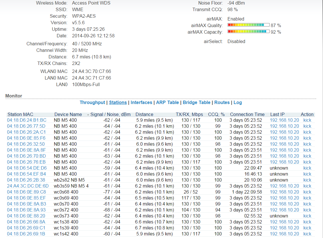 Alex-Pilot Posted September 26, 2014 Author Posted September 26, 2014 Между прочим я никогда не жалуюсь на работу Ubiquiti устройств. Работа данного железа меня полностью устраивает. Вот небольшой скрин сектора, загружен в среднем до 50 мбит/с, подключены юрики с довольно большими скоростями (10-15 мбит/с). Еще парочка таких включений и больше на этот сектор никого включать не буду. Двое подчеркнутые красным это с перекрытой наполовину зоной Френеля (очень не хотелось их включать, но пришлось по ряду причин). У этих двух и прием хуже и CCQ около 97-98% (со стороны клиентов, у остальных 99). С клиентской стороны стоят шесть Nanobridge M5 и один Powerbridge M5. Вставить ник Quote
