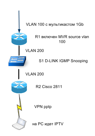 dubcon Posted September 11, 2014 Posted September 11, 2014 (edited) В наличие такая схема. На роутер R1 приходит поток мультика 1Г vlan 100, на этом же роутерe включен MVR. За ним стоит коммутатор S1 d-link с включенным igmp snooping vlan 200. За ним во vlan 200 стоит R2 CISCO 2811 FE 0/1. К циске подключен PC с помощью pptp. Вот на самом PC хочется увидеть IPTV. Накидал кое-что но пока смотреть не получается. Возможно ли это хоть теоретически? ip igmp snooping multilink bundle-name authenticated ! vpdn enable ! vpdn-group VPN ! Default PPTP VPDN group accept-dialin protocol pptp virtual-template 1 l2tp tunnel receive-window 1024 interface FastEthernet0/1 description Servers ip address 145.145.145.85 255.255.255.224 duplex auto speed auto ! interface Virtual-Template1 ip unnumbered FastEthernet0/1 peer default ip address pool VPN no keepalive ppp authentication pap chap ms-chap ms-chap-v2 ip local pool VPN 145.145.145.88 145.145.145.89 Edited September 11, 2014 by dubcon Вставить ник Quote