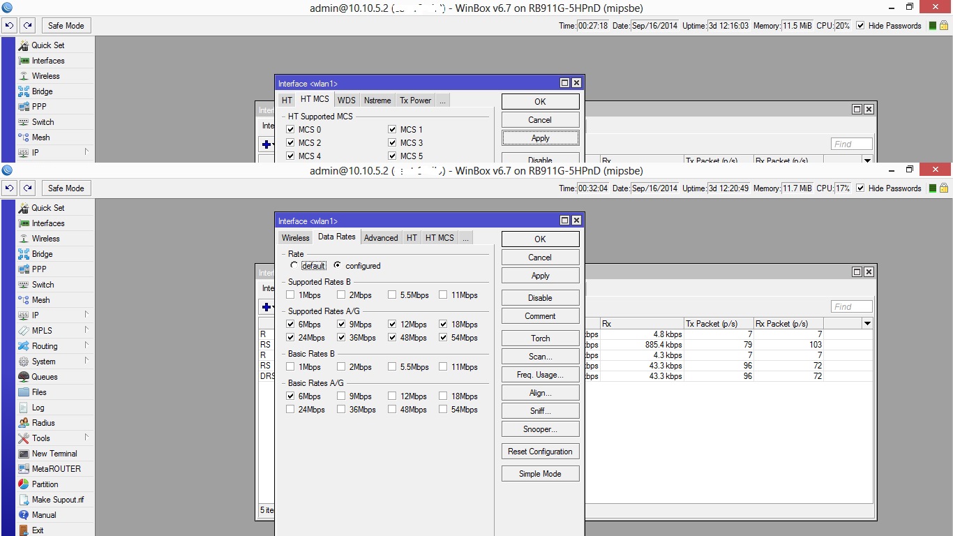 chetkiyparen Posted September 15, 2014 Author Posted September 15, 2014 (edited) Вам надо обновить везде на прошивку 6.19. После чего уменьшить мощность до 18дбм или ниже. Потом на БС на вкладке Data Rates поставьте Configured и снимите все галочки, на вкладке HT MCS снимите все галочки у 0-7 и оставьте только у 8-15, далее можете снимать снизу в обоих пунктах, оставляя только 10-15, 11-15, 12-15, 13-15 и так далее, вплодь до только 15. Естественно нужно подобрать свободную частоту и правильно навести антенны. В крайнем случае поставьте полосу 40 и канальные скорости пониже, если на максимальных плохо работает. Нормальные уровни сигналов это около -60..-65, но никак не сильнее. Потестил канал по TCP, получилось примерно 30/70Мбит, все же лучше, чем реальная скорость через канал до спидтеста Если можно, то подробнее что и как значат эти параметры для канальных скоростей?! Edited September 15, 2014 by chetkiyparen Вставить ник Quote
