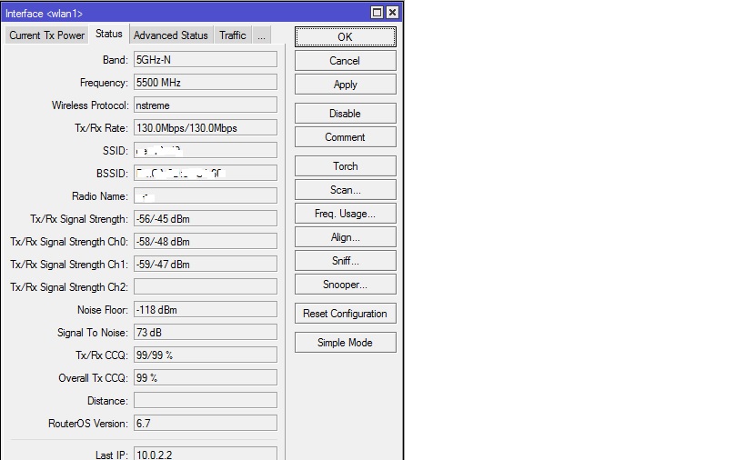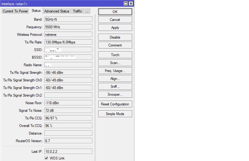 slv700 Posted September 14, 2014 Posted September 14, 2014 Поднят линк на Sextant, расстояние 1км, наблюдается проблема в скорости канала, изначально поднялся на 130/130 Мбит/c, но постоянно перепрыгивает на 130/6 по непонятной причине, т.к. качество линка по другим параметрам более чем удовлетворительное... Единственное, что наводит на мысль, что в данном линке используются разные платы - одна была поменяна на гигабитную, т.к. штатных плат уже нет в продаже отдельно и на ней стояла версия OS 6.7. Настроил ее в бридж, а в качестве клиента плата с OS 5.22. Возможно ли данная проблема из-за программного сбоя? И еще когда настраивал плату с 6.7 по инструкции http://www.lanmart.ru/blogs/mikrotik-sextant-bridge/, то почему-то не могу выставить вручную Tx Power Запускаю тест скорости, на прием и передачу прокачивает до 75Мбит/c, но в реальности скорость на линке прыгает, запускаю через этот линк speedtest.net и максимум до 8-10Мбит прокачивает и то после перезагрузки линка, до него канал во внешку до 50Мбит тестится. Причина- помехи и потери пакетов. Поэтому падает TCP ( Спидтест). Проверьте канал Btest TCP. Если будет как Спидтест -намного меньше UDP 75 Мбит/c, то все так и есть. Можно только пробовать менять частоту, фиксировать сверху скорость- data rate,пробовать Nstreme, Nv2. Если ничего не поможет- ставить устройства под внешнюю антенну и антенну диш ( нужно повысить энергетику , чтобы победить помеху). Да, диш на 1 км !!! или вообще ставить другое оборудование, более стабильное в условиях помех, например Камбиум ePMP Integrated- проблему конкретно в Ваших условиях линка победит на раз. Вставить ник Quote