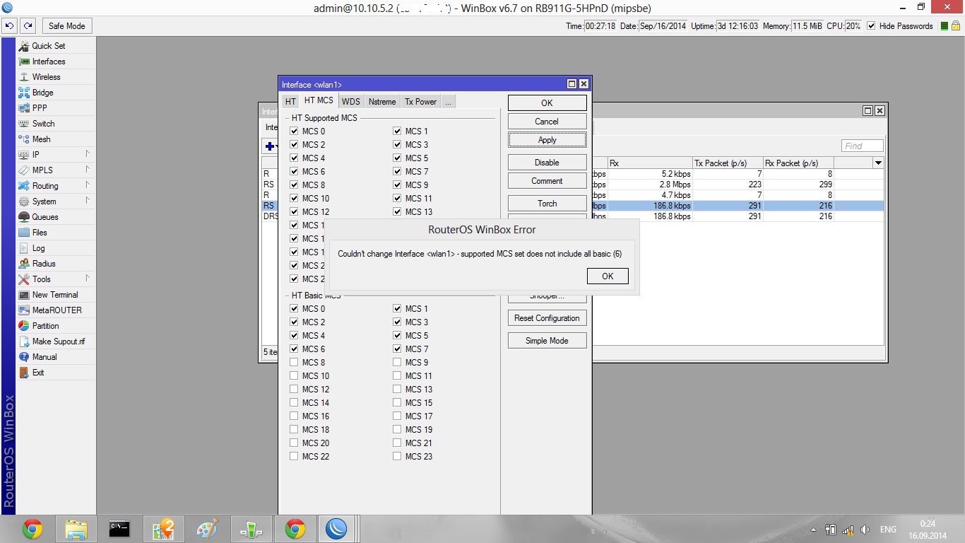 chetkiyparen Posted September 13, 2014 Posted September 13, 2014 (edited) Поднят линк на Sextant, расстояние 1км, наблюдается проблема в скорости канала, изначально поднялся на 130/130 Мбит/c, но постоянно перепрыгивает на 130/6 по непонятной причине, т.к. качество линка по другим параметрам более чем удовлетворительное... Единственное, что наводит на мысль, что в данном линке используются разные платы - одна была поменяна на гигабитную, т.к. штатных плат уже нет в продаже отдельно и на ней стояла версия OS 6.7. Настроил ее в бридж, а в качестве клиента плата с OS 5.22. Возможно ли данная проблема из-за программного сбоя? И еще когда настраивал плату с 6.7 по инструкции http://www.lanmart.ru/blogs/mikrotik-sextant-bridge/, то почему-то не могу выставить вручную Tx Power Запускаю тест скорости, на прием и передачу прокачивает до 75Мбит/c, но в реальности скорость на линке прыгает, запускаю через этот линк speedtest.net и максимум до 8-10Мбит прокачивает и то после перезагрузки линка, до него канал во внешку до 50Мбит тестится. Edited September 13, 2014 by chetkiyparen Вставить ник Quote