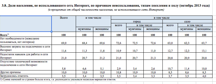wanderer_from Posted September 24, 2014 Posted September 24, 2014 Там есть с кем, там не о чем общаться. Вань, я устал уже повторять, что твой личный опыт - это только твой личный опыт. И вообще - места надо знать :) И вот тебе данные аж от целого Госкомстата с причинами, почему норот не хочет пользоваться интернетами вообще Вставить ник Quote