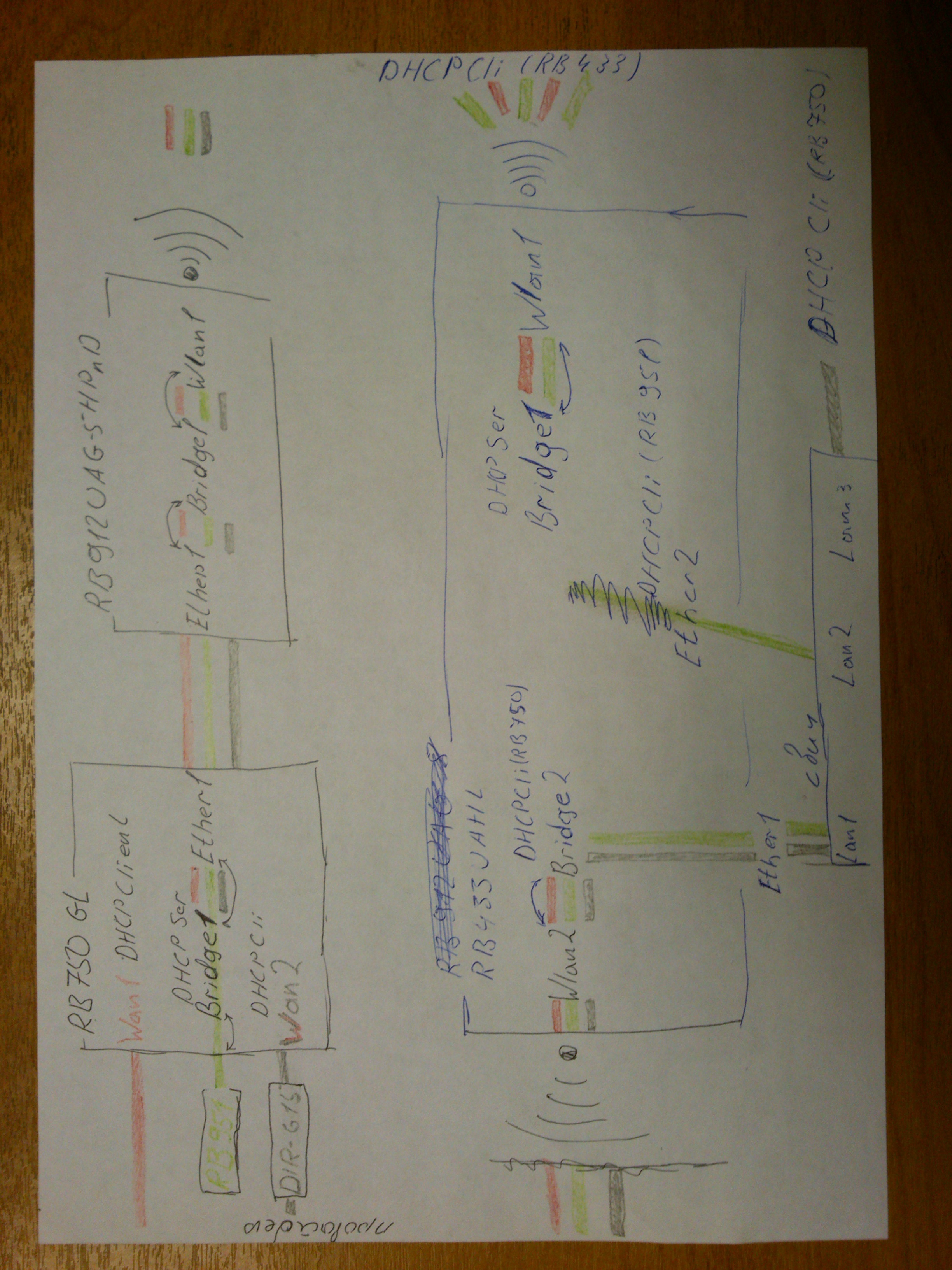 Kolik-an Posted September 24, 2014 Posted September 24, 2014 (edited) Задача токая есть 3 канала от одного провайдера расстояние 10 километров и нас 23 человека сейчас выглядит вот так надеюсь схему поймете Каму интересны такие головоломки прошу помочь мне дали советы 1. Завести все каналы напрямую в микротик 2. КАЖДЫЙ канал прокинуть до 433 по L2 - это позволит значительно разгрузить и без того слабенький 750й 3. На 433 поднять внутренюю сеть с одним ДХЦП 4. Прописать в ДХЦП статику для ваших клиентов 5. Распределить по каналам ваших клиентов средствами Микротик немогу разобраться в них Edited September 24, 2014 by Kolik-an Вставить ник Quote