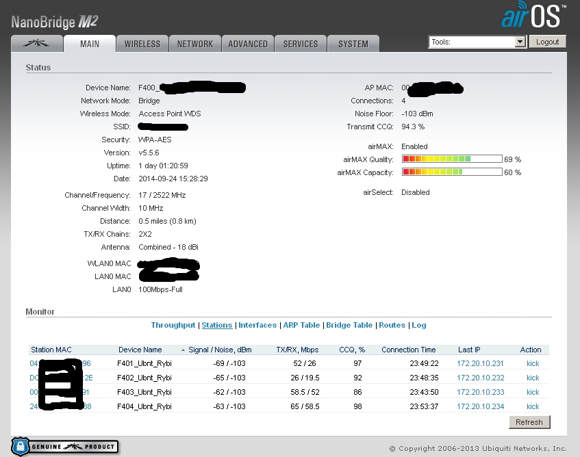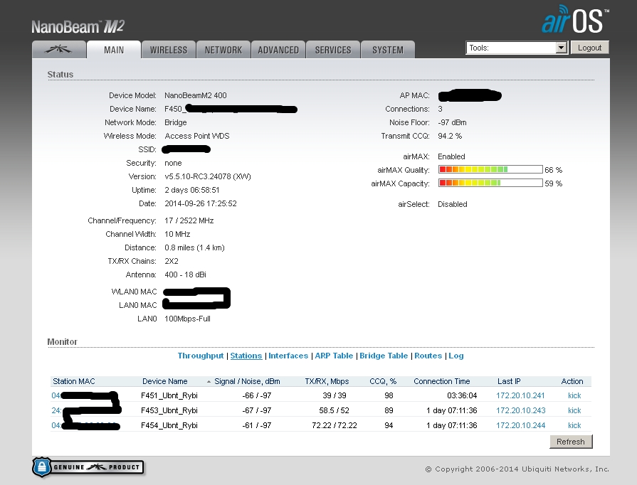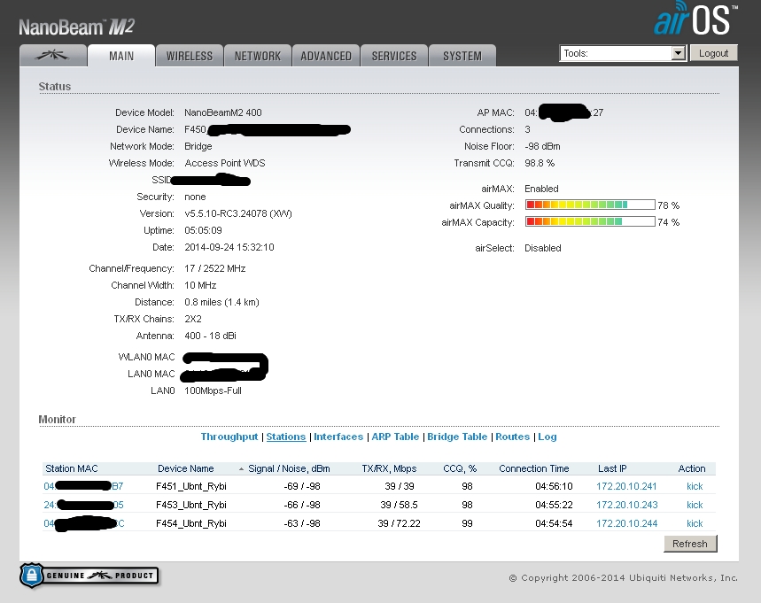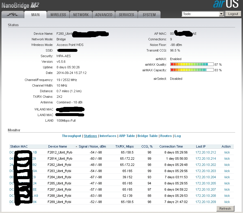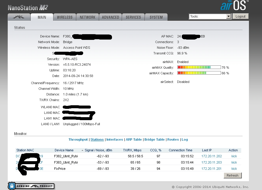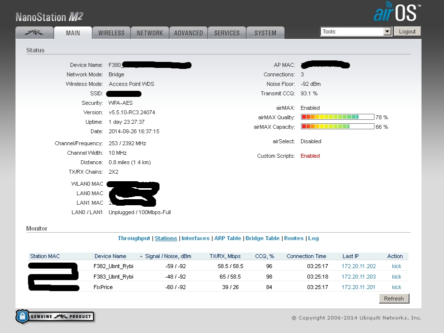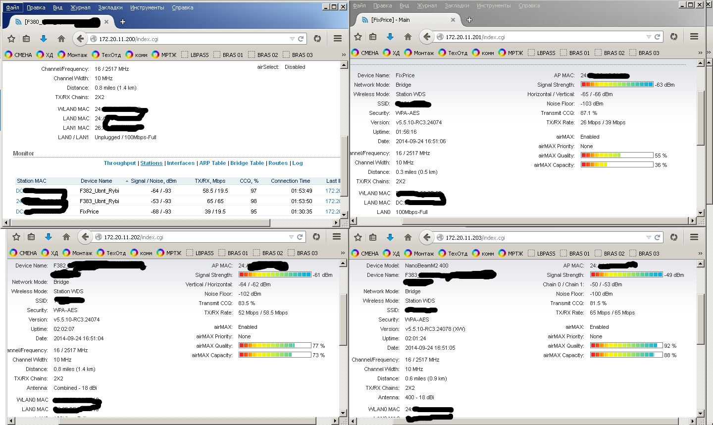 tofu Posted September 24, 2014 Posted September 24, 2014 День добрый, есть несколько баз, давайте для начала четыре. База 1 - Nanobeam m2 База 2 - Nanostation M2 База 3 - Nanobridge m2 База 4 - Nanobridge m2 На базах 3 и 4 есть клиенты Нанобриджи и Нанобимы, причем нанобриджей 90%. Проблем с базами нет. Все идеально. База 1 - подключены в режиме wds клиентов 4 нанобима, каждый день периодически начинаются качели, то отвалятся клиенты, то перестанет отвечать на ICMP база, иногда помогает ребут базы, иногда нет. Настроена изначально была также как и база 3 и 4, но сейчас уже кручу настройки как могу, поэтому отличаются. База 2 - клиента наностэйшн локо, нанобридж, нанобим. Также хаотично начинаются проблемы, у клиентов падает скорость, растет пинг до абонок, сами абонки по веб не открываются, ребут базы не помогает. На этой базе есть вланы, 3 влана. Управление и два абонентских. Сейчас все работает, поэтому сделаю скрины в рабочем состоянии. Первы два скрина - безпроблемные базы. 3 и 4 скрин проблемные базы. Пока делаю только майн, если нужно что-то еще для диагностики, скажите - сделаю. С нанобриджами вообще никаких пробем небыло, а с нанобимами я уже задолбался. агрегацию включать нельзя - станции отваливаются, на странице майн во вкладе stations - ip подключенных устройств не показываются. это только у меня такая хрень с ними? Меня уже трясет от них. Прошивки пробовал 5.5.6 5.5.8 5.5.9 5.6beta сейчас поставил частично 5.5.10RC3 Вставить ник Quote
