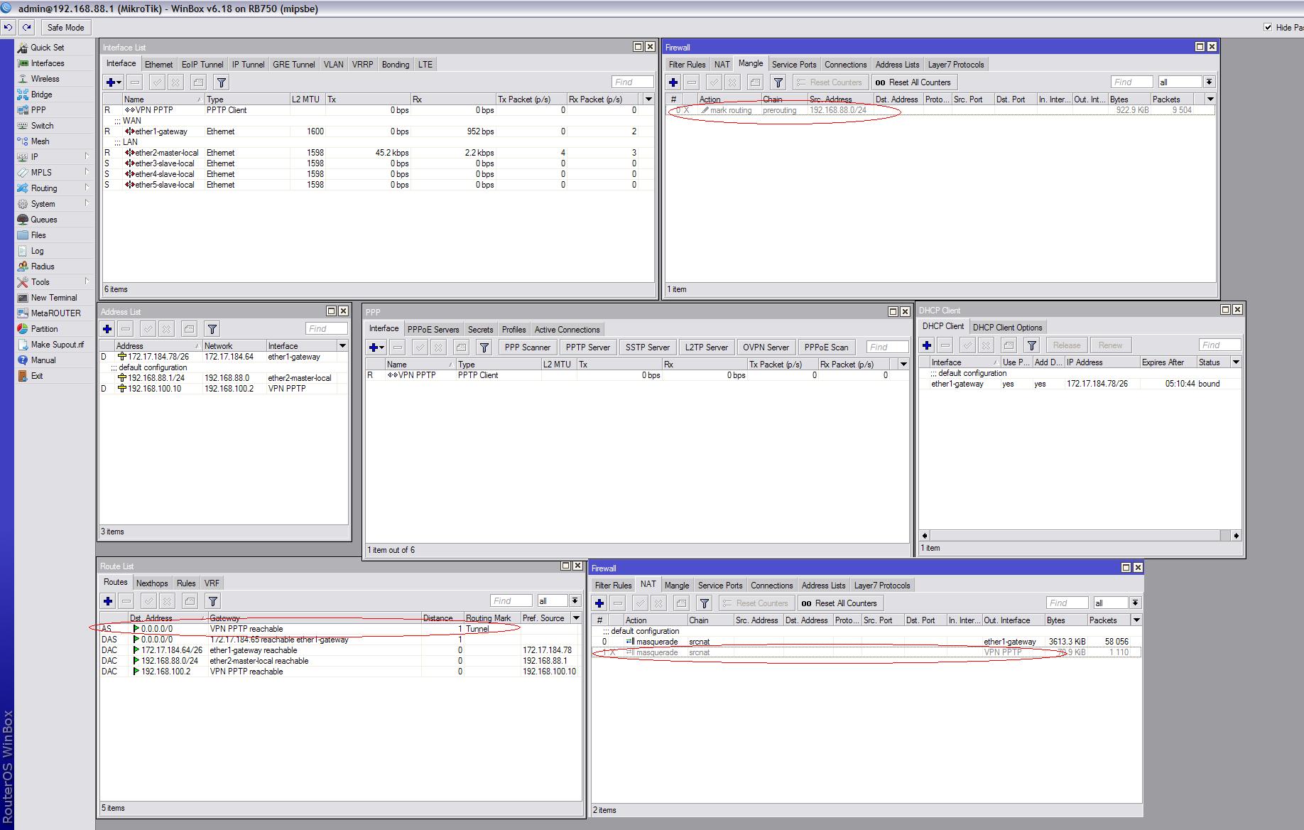 Brainiacs Posted October 2, 2014 Author Posted October 2, 2014 Вам надо создать маршрут 0.0.0.0/0 на адрес 192.168.100.2 (адрес впн сервера), указать у него маркировку например test. Далее в манглах создаете правило и указываете src.address=192.168.88.2 и действие mark routing = test. Соответственно для второго адреса аналогично. Если таких адресов будет много, нужно указать не адрес, а src.address list, соответственно в него и будете помещать адреса компьютеров, которые нужно пустить по этому маршруту. 1. Добавил маршрут - routing mark - Tunnel 2. В Mangle создал правило chain - prerouting; src.Address - 192.168.88.0/24; action - mark routing, new routing mark - Tunnel, passthrough - yes Перестал работать Интернет и сеть за VPN не доступна((( 3. Добавил правило в NAT chain - srcnat; out.Interface - VPN PPTP; action - masquerade Появилась сеть за VPN (192.168.100.0/24), вроде то что нужно, но нет Интернета((( В принципе понятно почему, но можно ли сделать, чтобы и сеть за VPN (192.168.100.0/24) и Интернет работали и как это сделать??? P.S. На скриншоте, отключил пока nat - vpn, и mangle! With Best Regards Brainiacs Вставить ник Quote