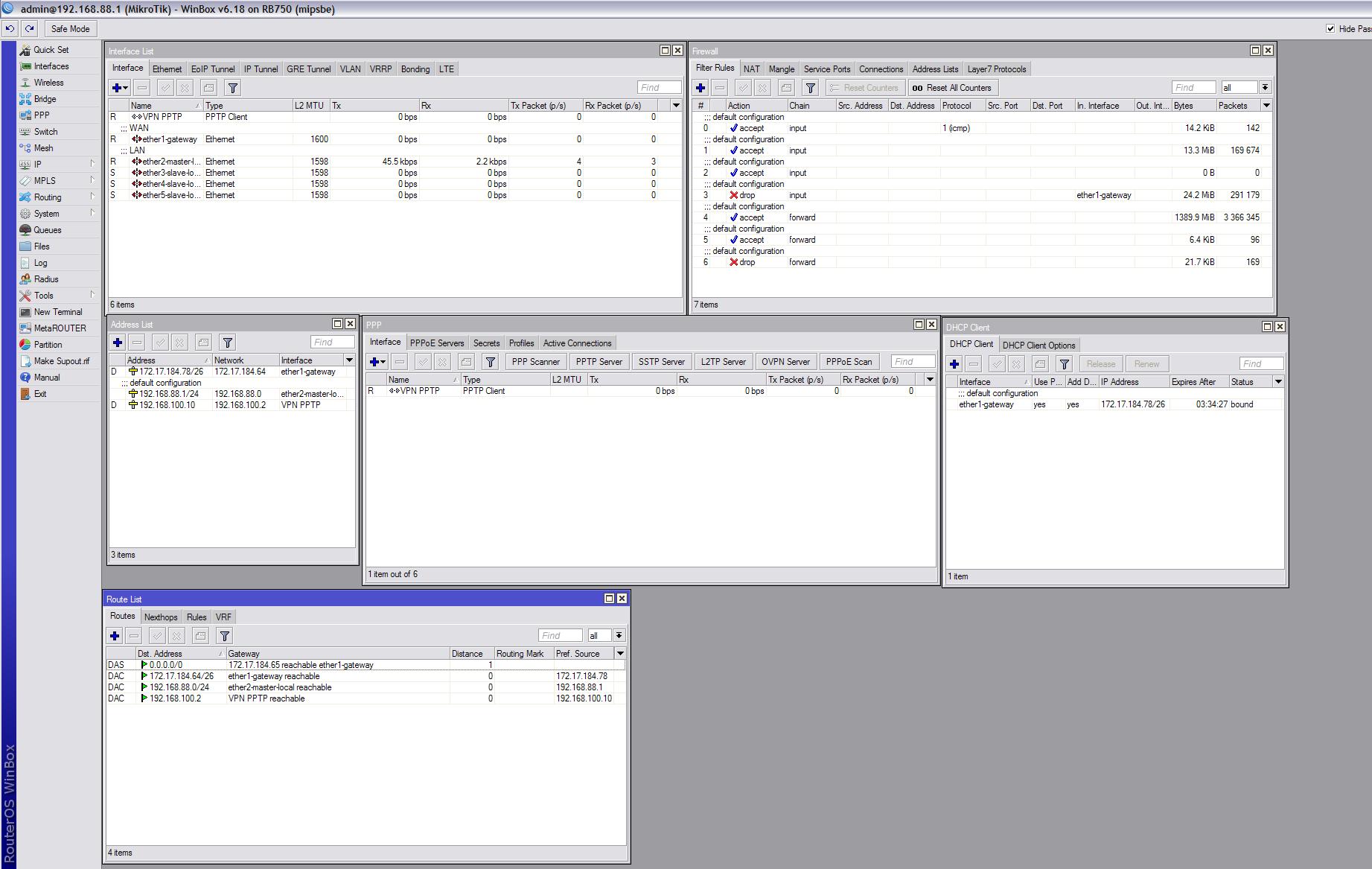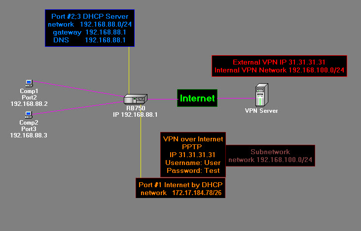 Brainiacs Posted October 1, 2014 Posted October 1, 2014 Доброго времени! Помогите, пожалуйста, с маршрутизацией, не очень разбираюсь в MikroTik'ах. Исходные данные: MikroTik RB750 RouterOS 6.18 Port #1 Internet by DHCP network 172.17.184.78/26 + VPN client PPTP на VPN server 31.31.31.31 internal network 192.168.100.0/24 Port #2;3 DHCP 192.168.88.0/24 Будет 2-а компьютера [Comp1 (192.168.88.2) и Comp2 (192.168.88.3)] Нужно: Чтобы весь трафик с Comp1 и Comp2 маршрутизировался в VPN сеть 192.168.100.0/24 Подскажите, что донастроить надо??? With Best Regards Brainiacs Вставить ник Quote