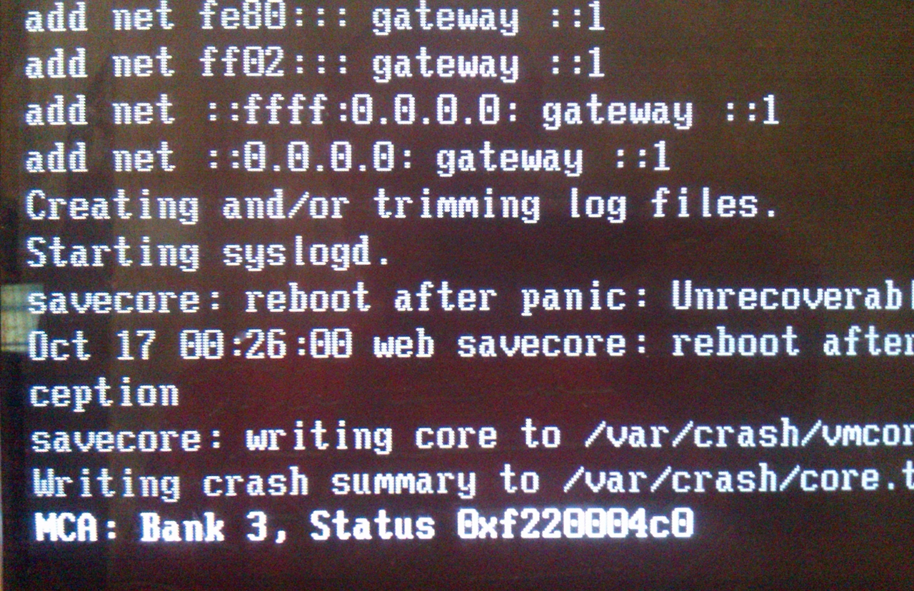 NeXuSs Posted October 17, 2014 Author Posted October 17, 2014 (edited) Всего имеется 4 планки по 1Gb, сначала оставил одну - сервер ушел в перезагрузку после ~15 минут работы. Оставил вторую планку 1Gb, сервер поработал какое-то время (меня на работе уже не было), а потом опять перезагрузился. Обнаружил я его утром в наглухо зависшем состоянии (см. фото). Установил FreeBSD 10.0 i386 - результат тот же, перезагрузка через 10 - 15 минут работы. Edited October 17, 2014 by NeXuSs Вставить ник Quote