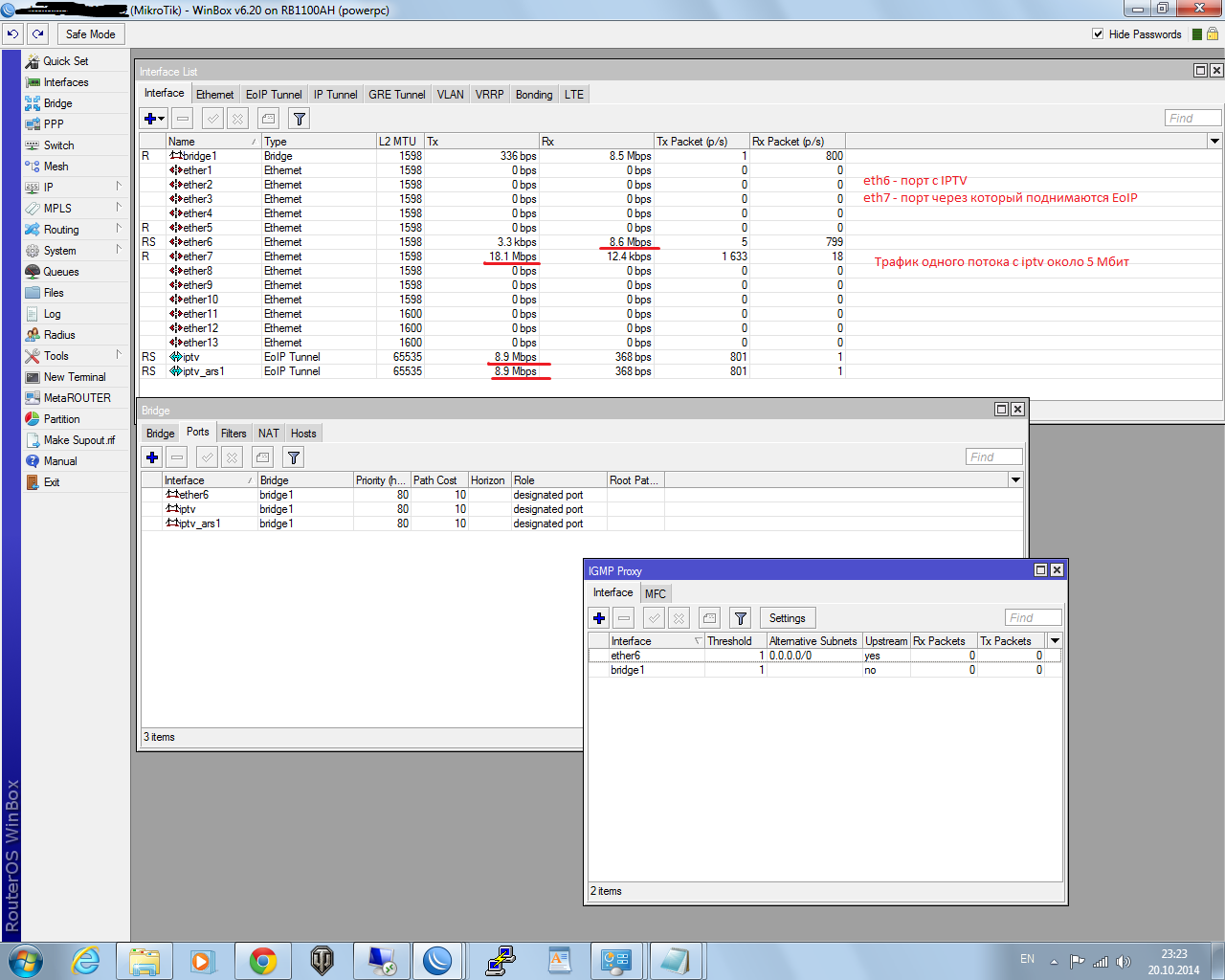 hrom_scorpio Posted October 20, 2014 Posted October 20, 2014 Доброго времени суток. В поиске решения проблемы не нашел. так что не пинайте сильно))) Дано: iptv приходящее на порт микротика. igmp на микротике настроено и прекрасно работает. Два линка EoIP до точек куда пробрасывается мультикаст. Порт микротика куда приходит iptv и 2 EoIP объеденены в bridge. ТВ показывает без нареканий на обоих точках. НО... в оба туннеля уходит двойной трафик. Собственно вопрос: как избавится от этого двойного трафика? На скрине думаю более понятно. Вставить ник Quote