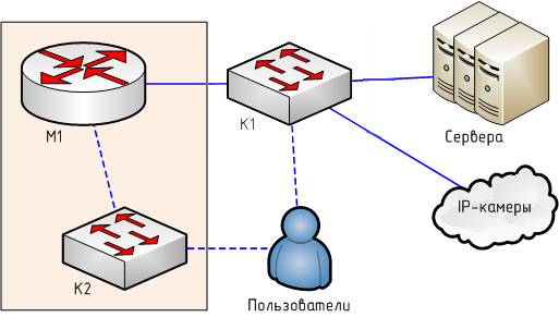 alibek Posted October 22, 2014 Author Posted October 22, 2014 Ну схема то самая простая. Есть несколько сотен IP-камер. Есть сервисное оборудование (сервера), работающее с этими камерами, их общее количество будет в пределах десяти хостов (максимум двадцати). По разным соображениям желательно камеры и сервера разместить в одном L2-сегменте. Есть также пользователи, которые будут работать с серверами, пользователей планируется не более 30. Пользователи должны работать только с серверами, к остальным устройствам доступ им давать не нужно. М1 и К2 на схеме — это физически одно устройство (Catalyst 3750). IP-адресация: Для всей сети выбрана 10.102.0.0/16. В /24 устройства не влезут, поэтому чтобы заморачиваться с учетом IP-адресов, она весьма прореженная. 10.102.0.0/24 выбрана для сервисного оборудования (к которому пользователям должен предоставляться доступ), 10.102.1.0-10.102.9.255 используется для IP-камер. Остальные адреса не используются. Для пользователей я выбрал 10.102.200.0/24 из тех соображений, чтобы опять же не заморачиваться с учетом IP-адресов. То есть я знаю, что подсеть 10.102.0.0/16 целиком выделена для определенной задачи, и больше нигде ее использовать не буду. 10.102.0.0/16 полностью изолированная подсеть, в/к ней нет выхода в/из других сетей (за исключением 10.102.0.0/24, в которой через NAT прокинуто несколько сервисов). Если бы пользователи и сервисная сеть терминировались на разных маршрутизаторов, тогда бы все было проще. Но сейчас (и в будущем) М1 и К2 это физически одно устройство, Catalyst 3750E. Но мне тут напомнили про vrf-lite, это как мне кажется будет оптимальным решением. vacl очевидно тоже потребуется, На транки тоже можно вешать acl. В случае транка ведь ACL будет применяться ко всем VLAN? Вставить ник Quote